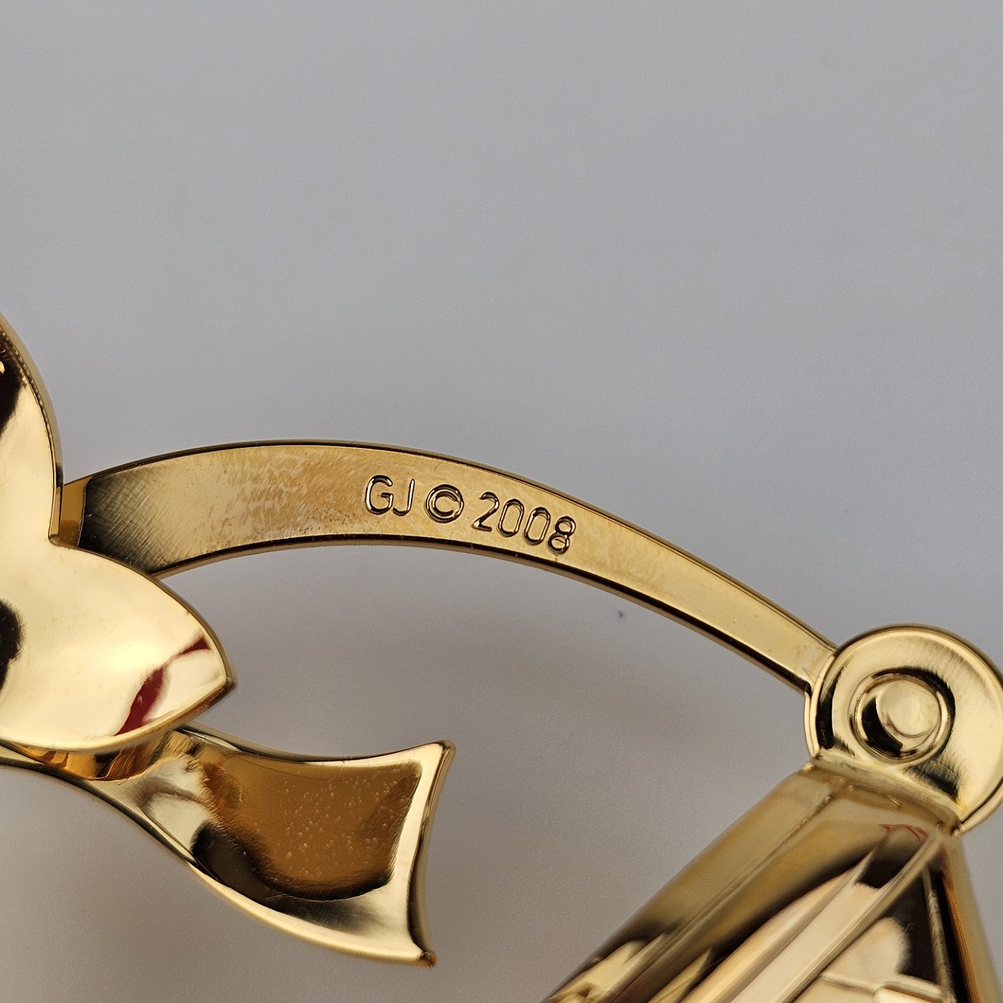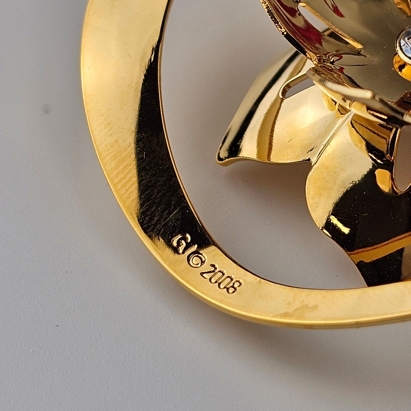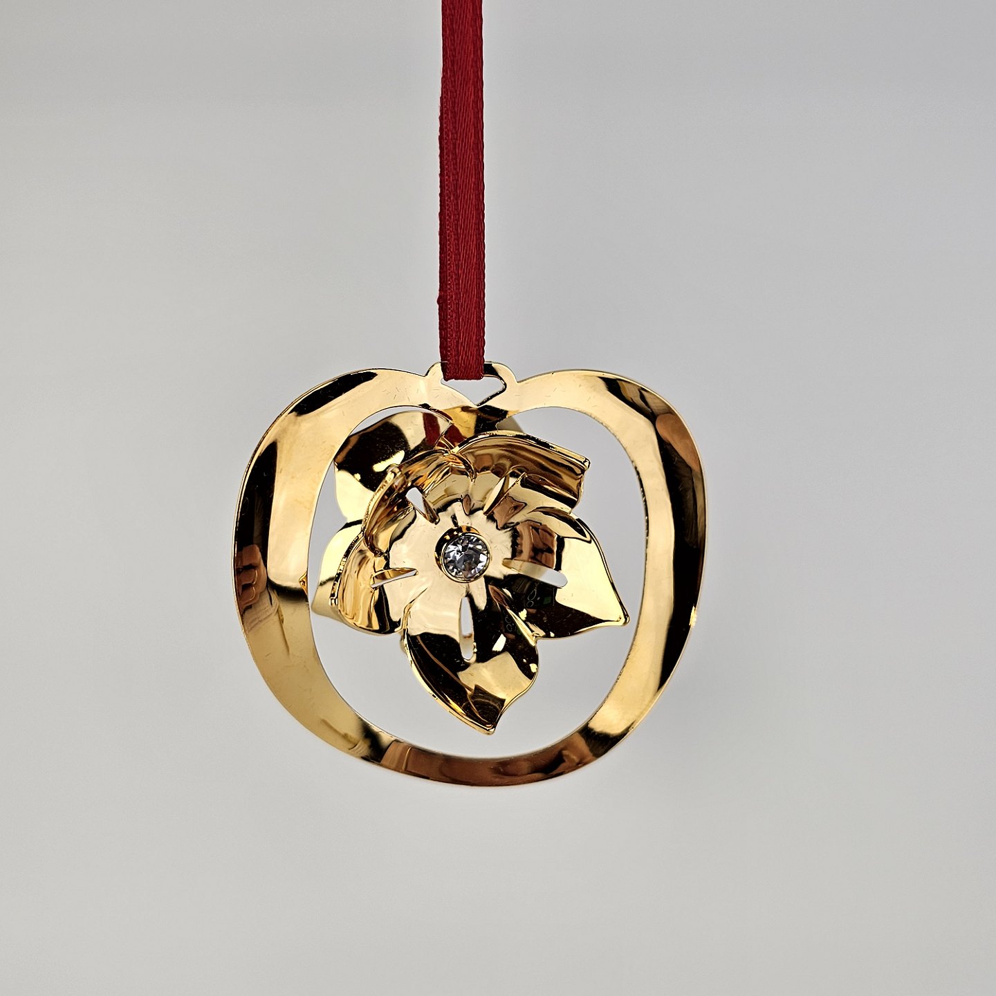 Text zugänglich auf Dänische: To juleornamenter til ophæng med form af en kurv og en julerose i messing forgyldt med 24 karat guld