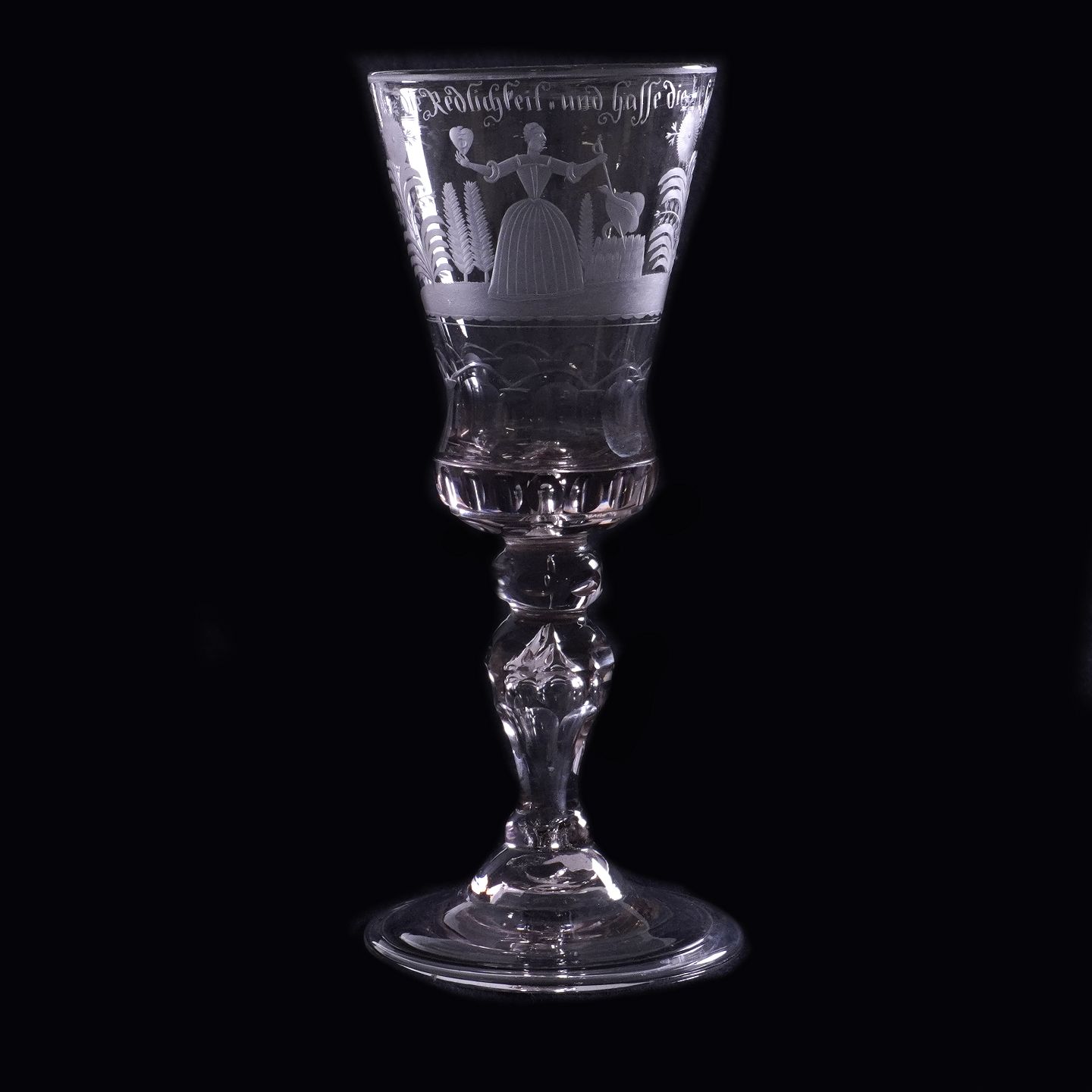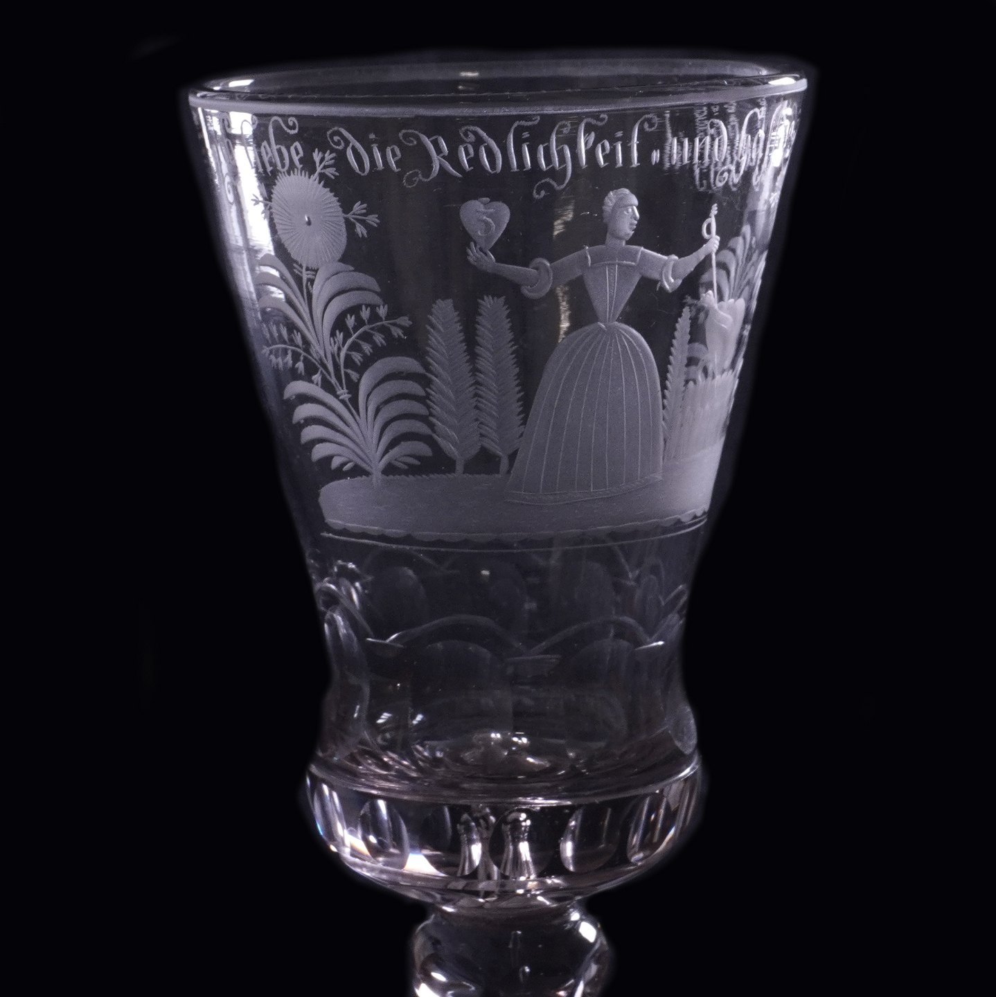 Deutscher Glaspokal mit der Gravur "Ich liebe die Redlichkeit und hasse die Falschheit". Sachsen oder Dresden um 1740. H: 21,5cm |