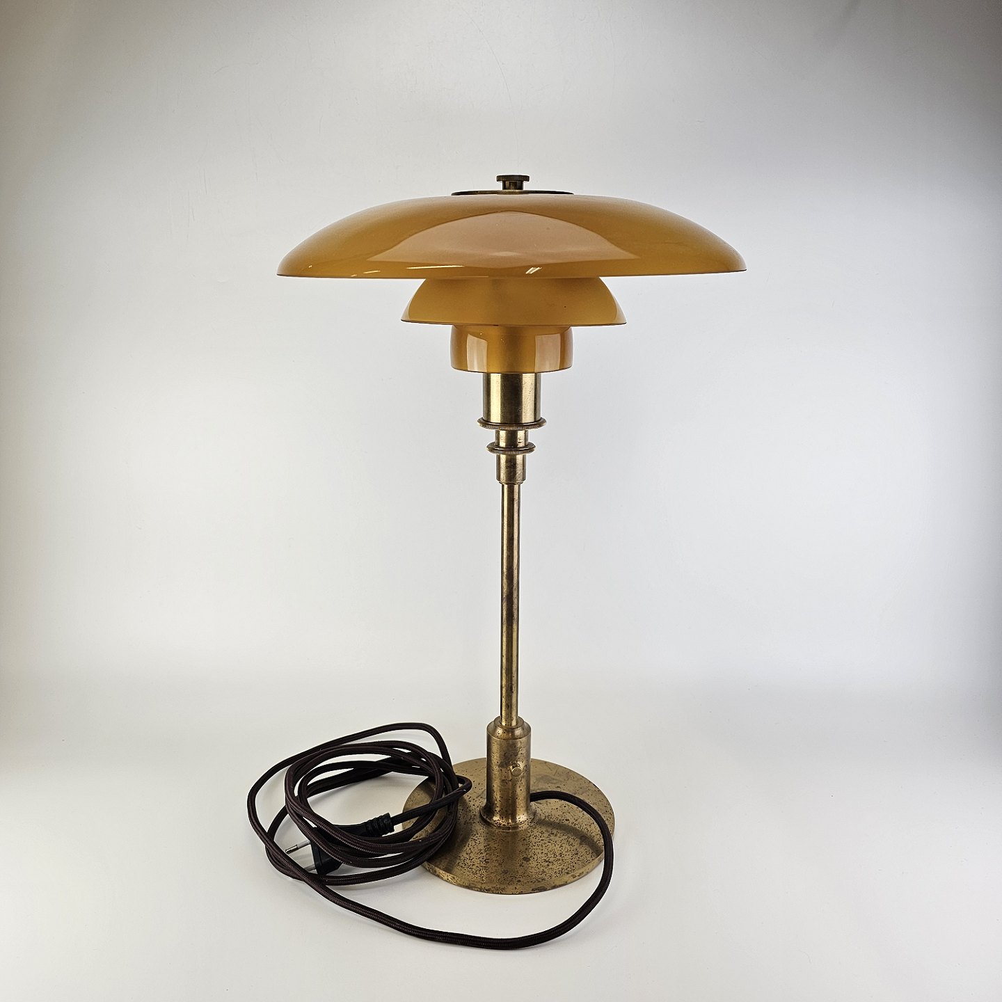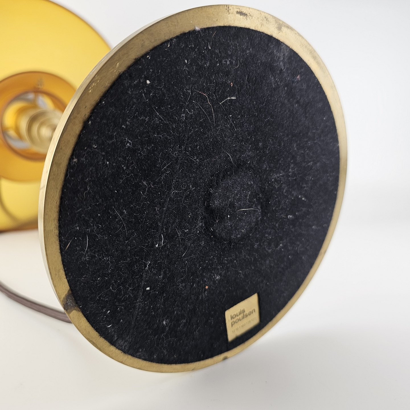 Text zugänglich auf Dänische: Bordlampe med skærm af mundblæst ravfarvet etlagsglas og fod af strøgslebet messing Limited edition udført efteråret 2018
