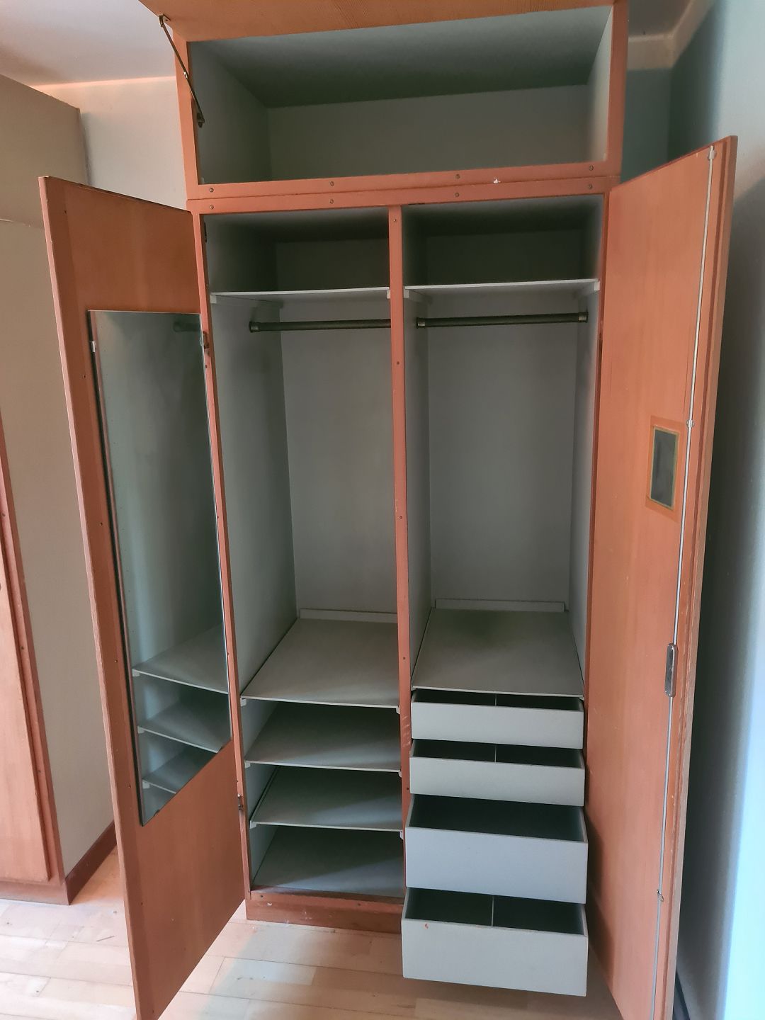 Text zugänglich auf Dänische: Boligens byggeskab fra 1960'erne med låger i Oregon pine designet af Børge Mogensen og Grethe Meyer. Fremstår i pæn brugt stand med uoriginalt spejl på indersiden af lågen og låsen virker, men griber ligesom ikke ordentligt fat. (Kan måske udbedres med lidt snilde) Kan evt. stå sammen med nr. 60675