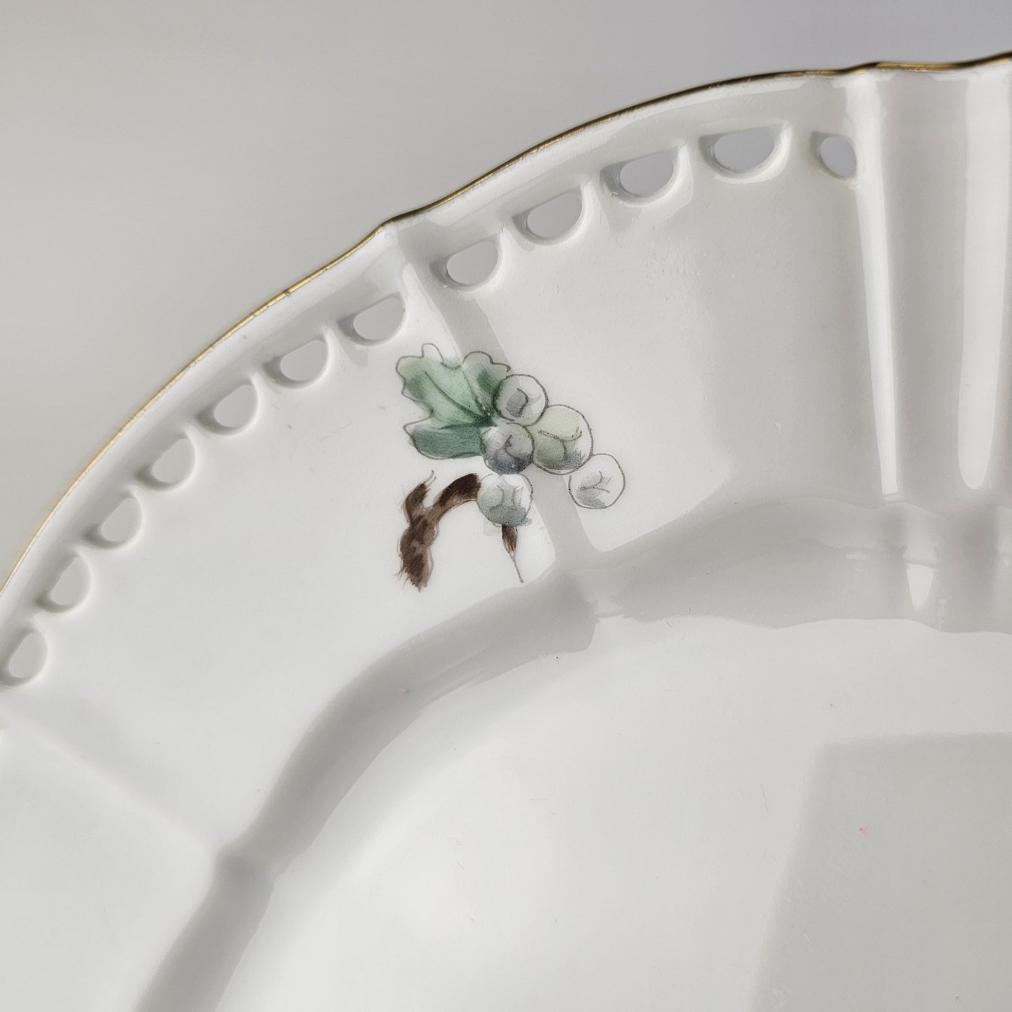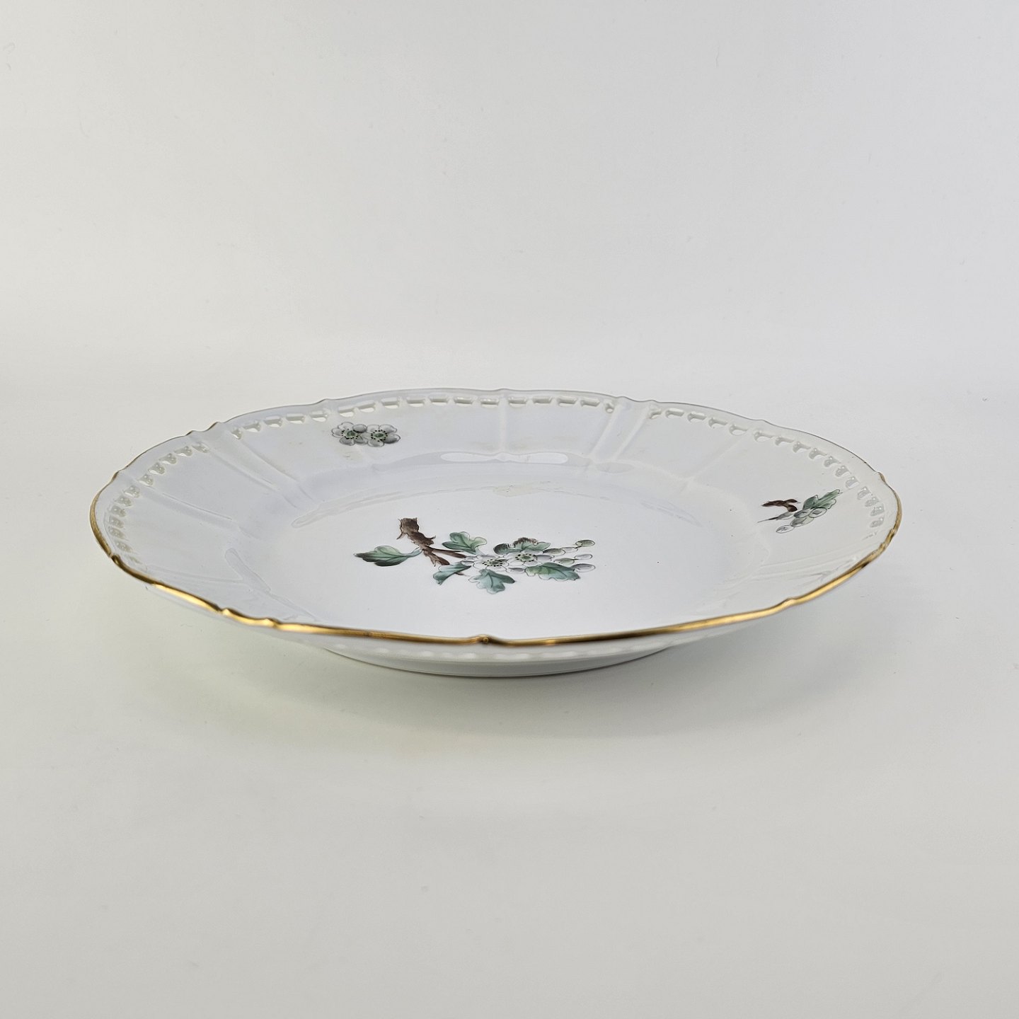 Eremitage er porcelæn dekoreret med hvidtjørn og guldkant, frokosttallerkenen har gennembrudt kant