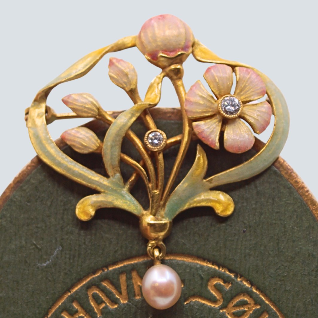 Art nouveau broche i 18 kt. guld med emalje, diamanter og perle