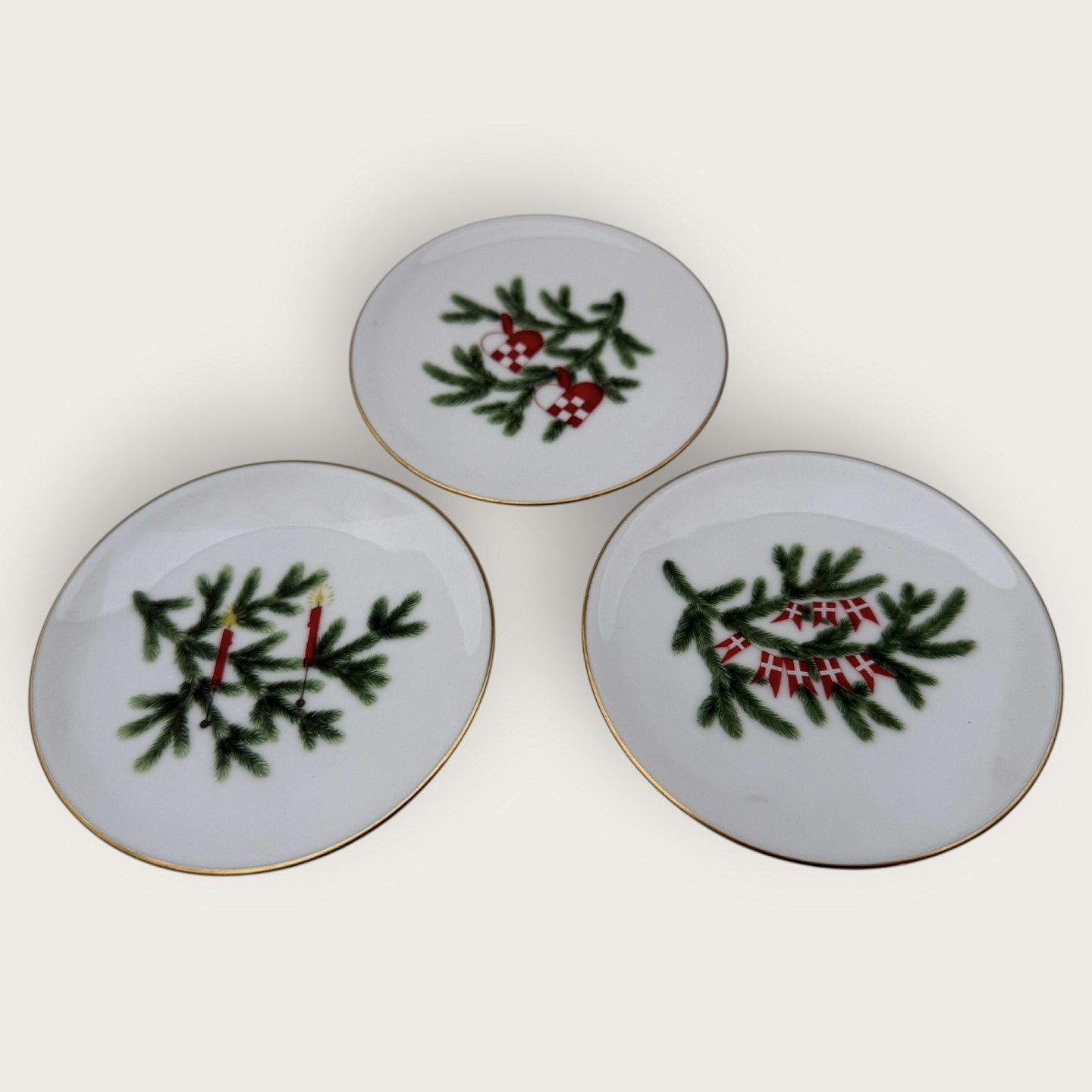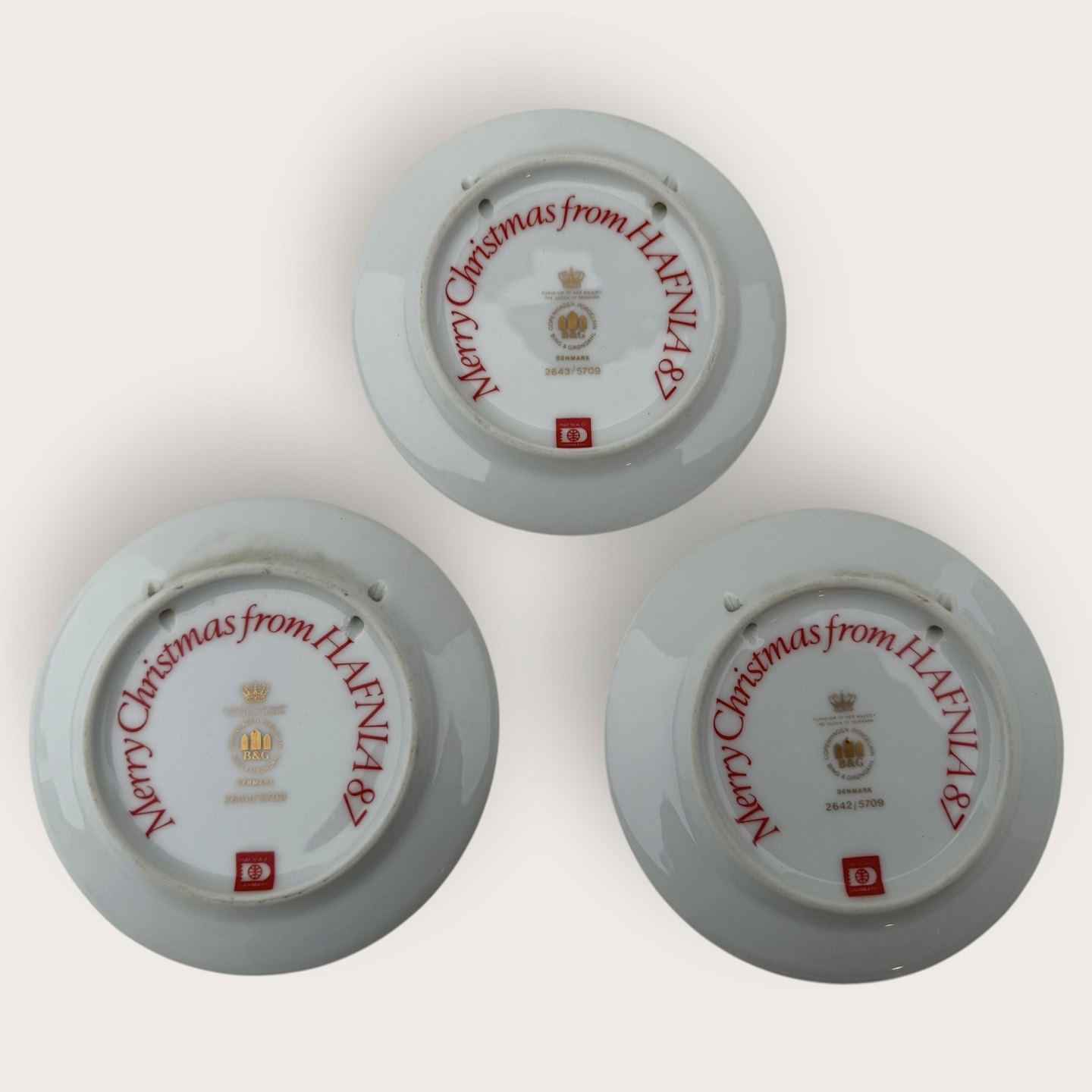 | Bing & Grøndahl, 3 kleine Weihnachtsteller, Frohe Weihnachten Hafnia 87, Nr. 2642/5709, 2643/5709 und 2644/5709, Durchmesser 10,5 cm, 1. Sortierung *sehr guter Zustand*