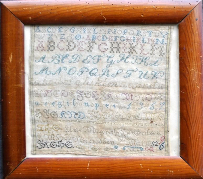 Namenstuch, hergestellt von Margrethe Hendriksen, Nivørødden am 6. Mai 1852. Dänemark. 28 x 28 cm.