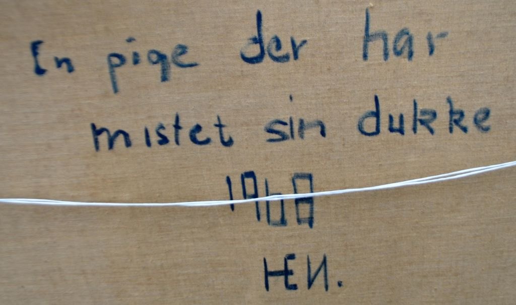Dänische Künstlerin (20. Jahrhundert): Ein Mädchen, das seine Puppe verloren hat. Öl auf Leinwand. Rückseitiger Text und Monogramm 1968. 66 x 100 cm. Gerahmt: 85 x 120 cm. Als Geschenk an den Kunsthändler Hans Erik Nielsen, Aarhus. Vermutlich ein Werk von Kaj Christensen.