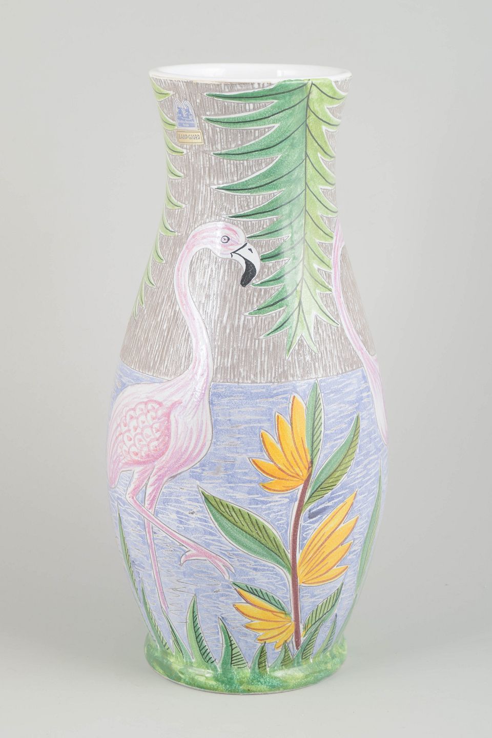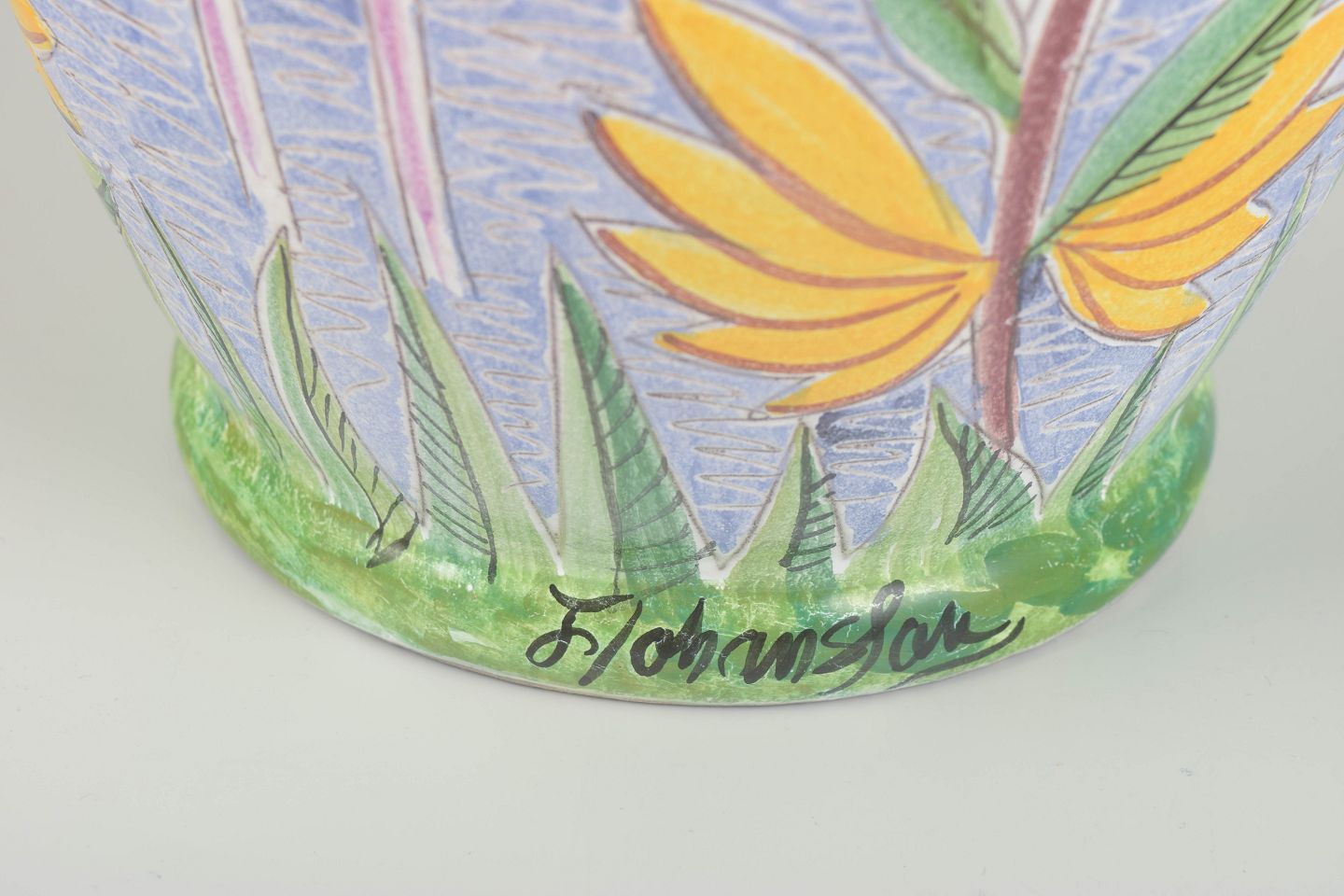 Dekorativ håndmalet keramikvase med tropisk motiv forestillende flamingoer og eksotiske blomster i pasteltoner. Signeret “Holmén” i bunden samt F. Johansson ved foden. Et markant eksempel på Holméns farverige og figurative formsprog fra Kloster Keramik.