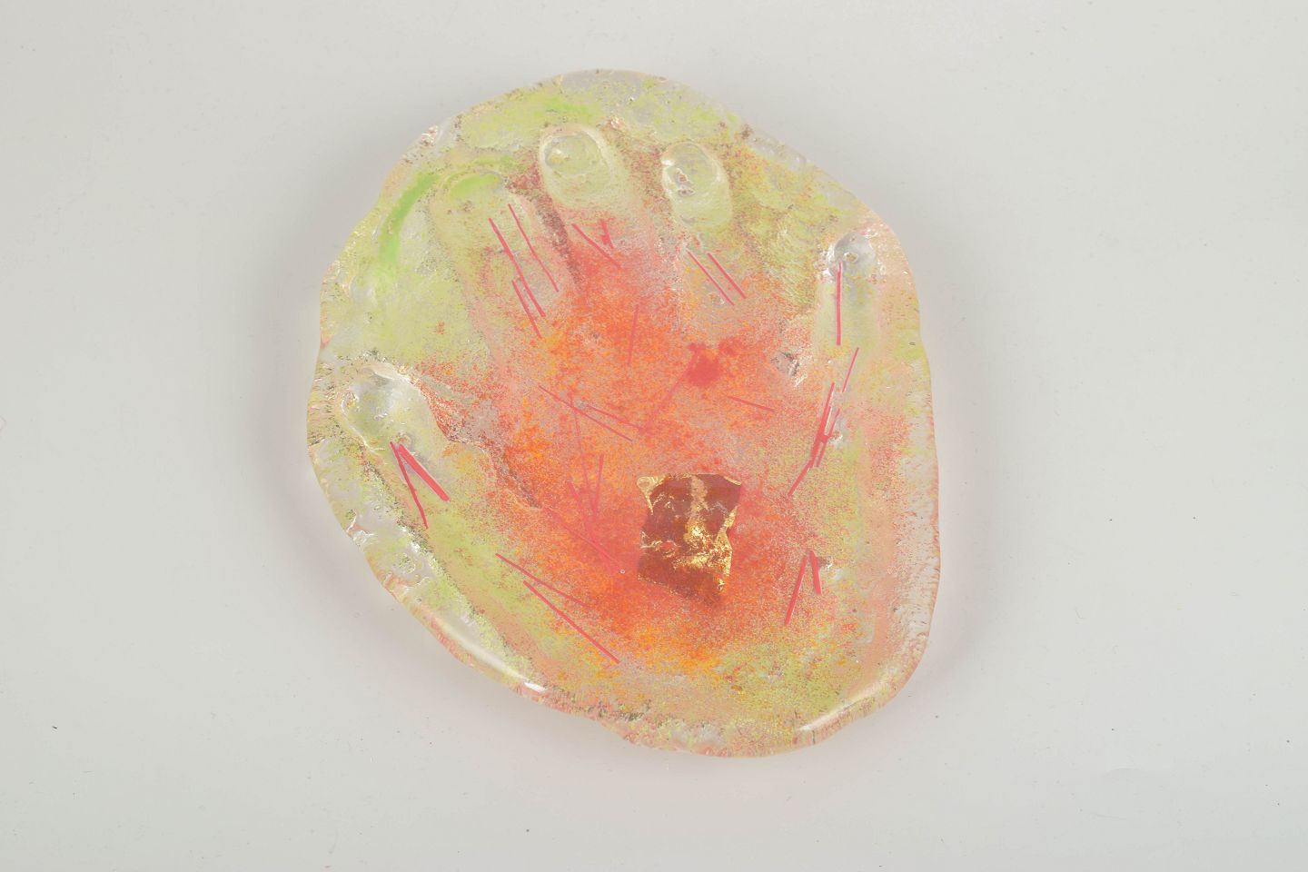 Håndformet glasrelief i form af en åben hånd, udført i transparente og fluorescerende nuancer af orange, gult og rosa med indlagte bladguldselementer. Et ekspressivt værk, der kombinerer symbolik og farveintensitet i typisk Ekegren-stil, hvor materialets lysrefleksion og overfladestruktur spiller en central rolle.