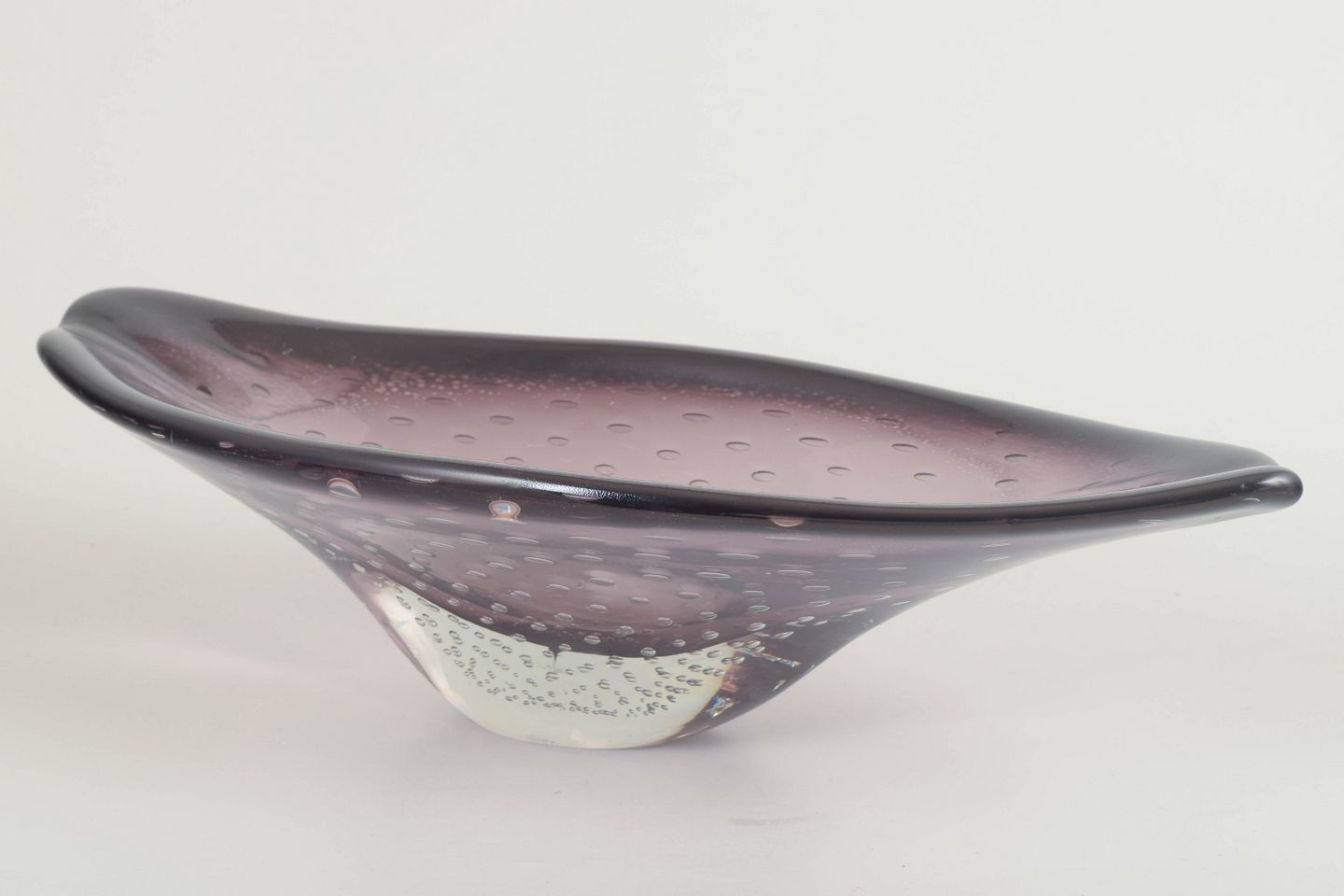 Stor, fritformet skål i mundblæst glas med klart og violettone glas med indlagte luftbobler og optisk struktur. Et elegant og skulpturelt stykke svensk studioglas fra 1970’erne, udført med teknisk præcision og sans for formens bevægelse.