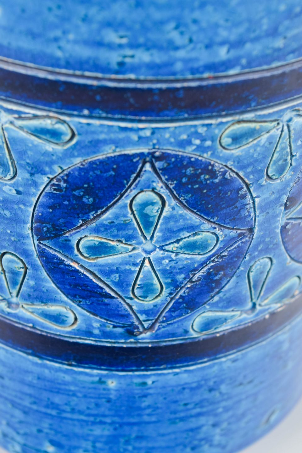 Høj cylindrisk vase i keramik med reliefdekoration og karakteristisk “Rimini Blu”-glasur i intense blå og turkise nuancer. Overfladen er håndglaseret med geometriske mønstre og brune bånd, der fremhæver seriens levende farvespil og tekstur. Et klassisk eksempel på Aldo Londis ikoniske formsprog for Bitossi.