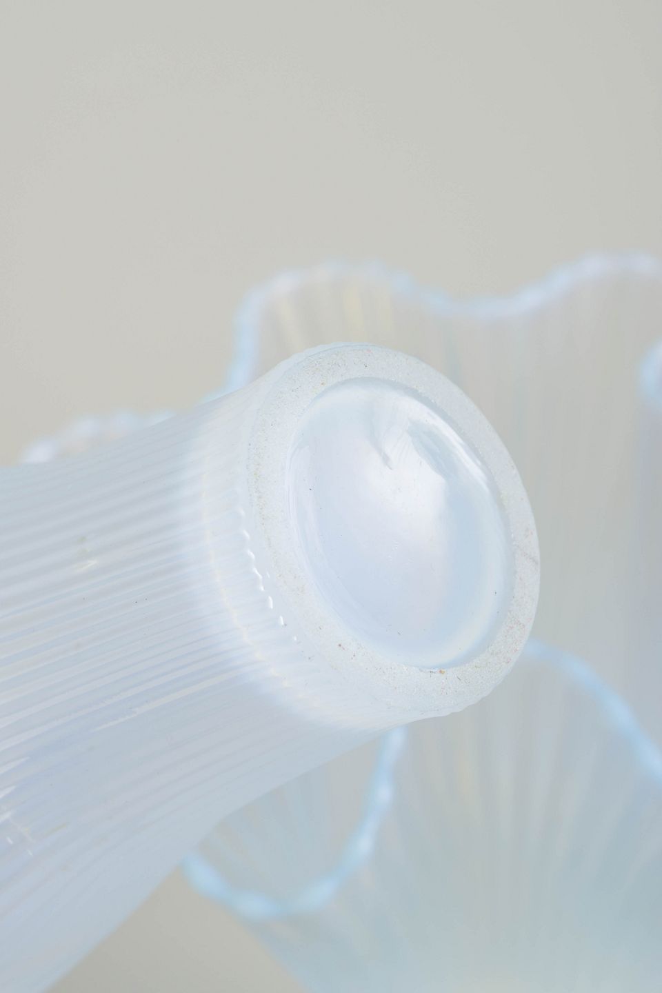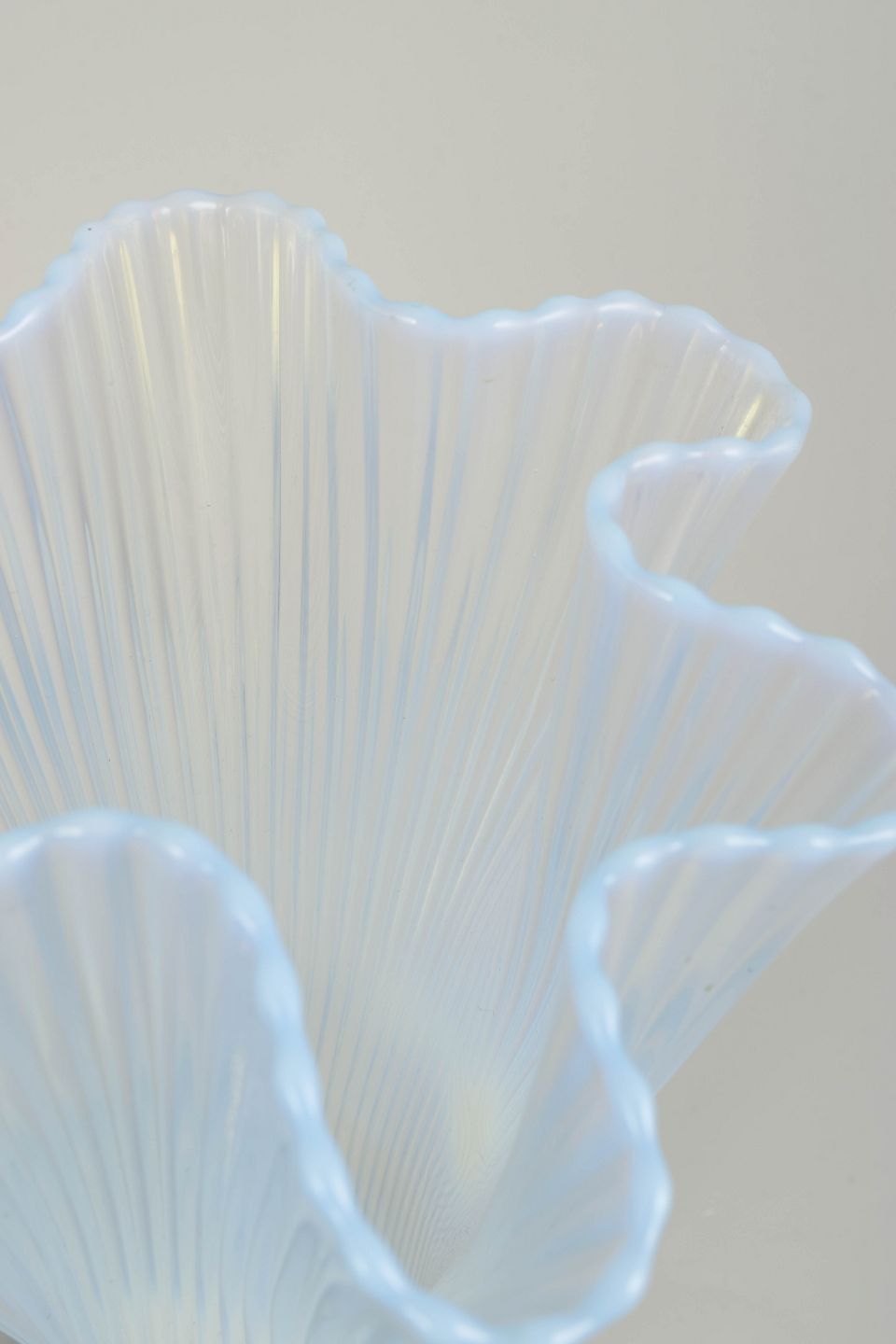 To mundblæste vaser i opaliseret glas fra serien “Reffla”, designet af Arthur Percy for Gullaskruf. Serien er kendetegnet ved sine elegante riflede sider og bølgende kanter, der fanger lyset smukt i det halvtransparente glas.