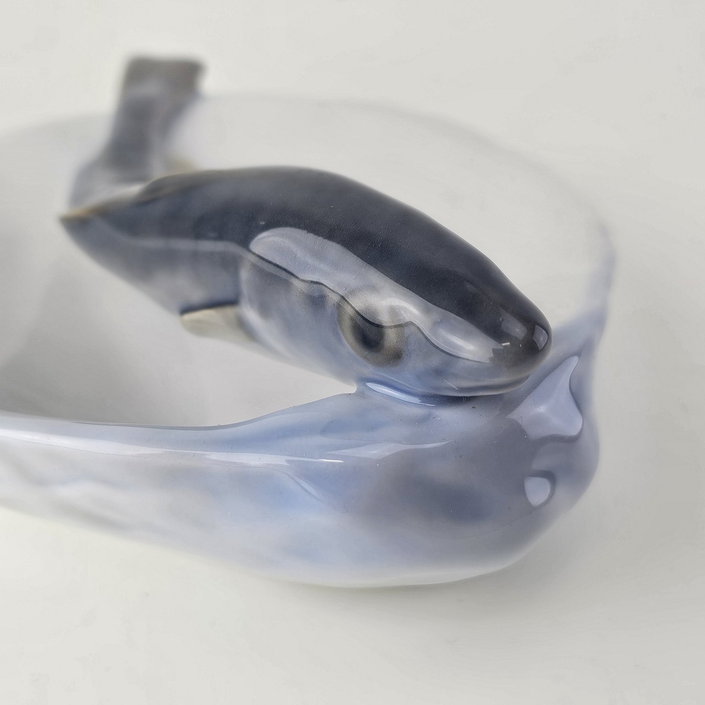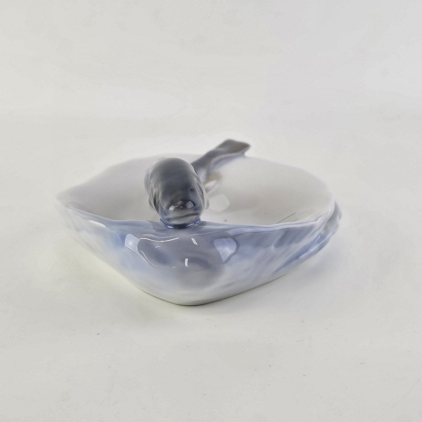 Sjælden skål i kongeligt porcelæn i art nouveau stil med form af to muslingeskaller med en fisk
