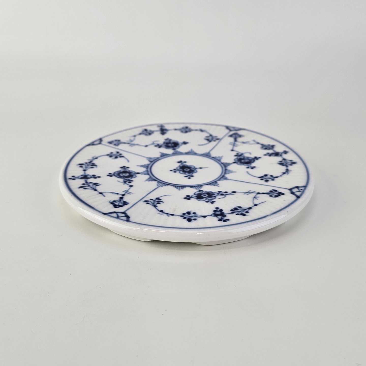 Musselmalet halvblonde er riflet hvidt porcelæn med dekoration af blå ranker og en kant med blonder.