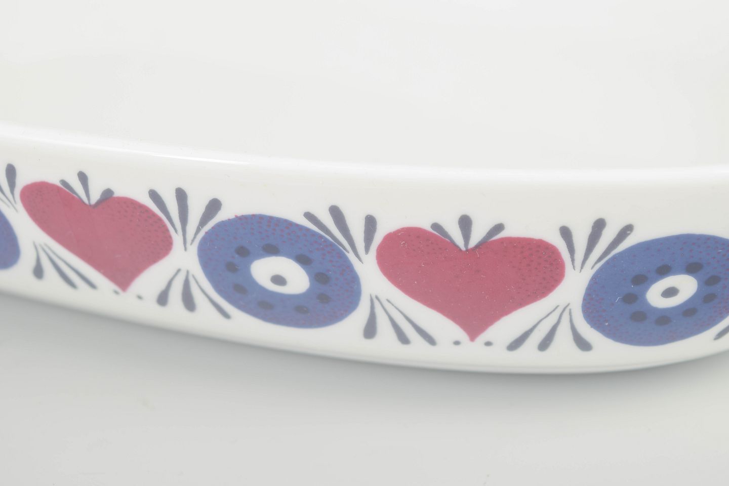 Dekoreret med Westmans karakteristiske retroblomstermotiv i blå og rosa på hvid bund. Serien Silja blev lanceret i 1960’erne som en del af Rörstrands funktionelle “El-Fast” stentøj, velegnet til både ovn og bord.