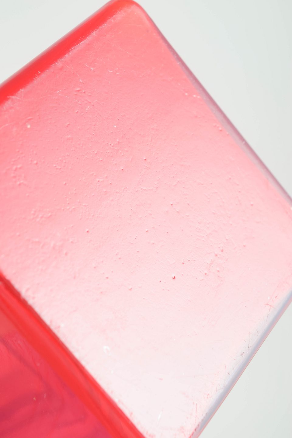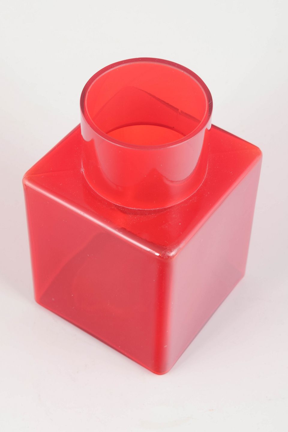 Geometrisk formet vase i klart rødligt glas med cylindrisk hals og firkantet korpus – et karakteristisk eksempel på italiensk Murano-design fra perioden.