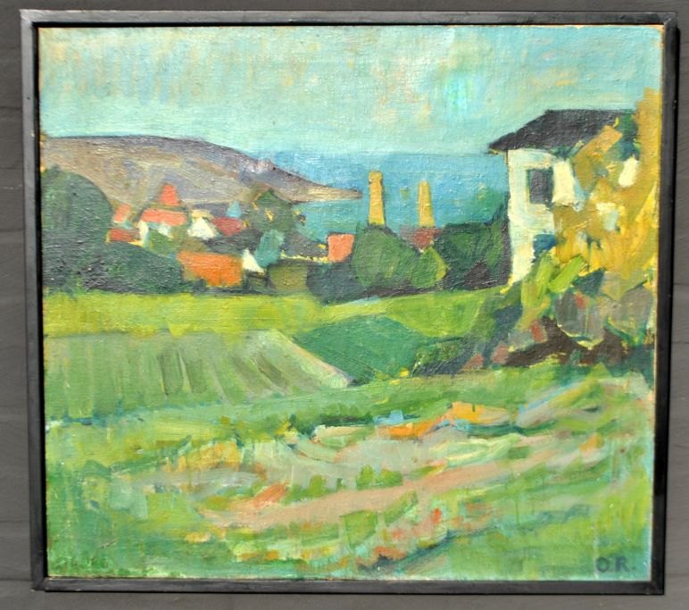 Dänischer Künstler (20. Jahrhundert): Stadtgebiet – Bornholm. Öl auf Leinwand. Signiert. OR 65 x 72 cm.