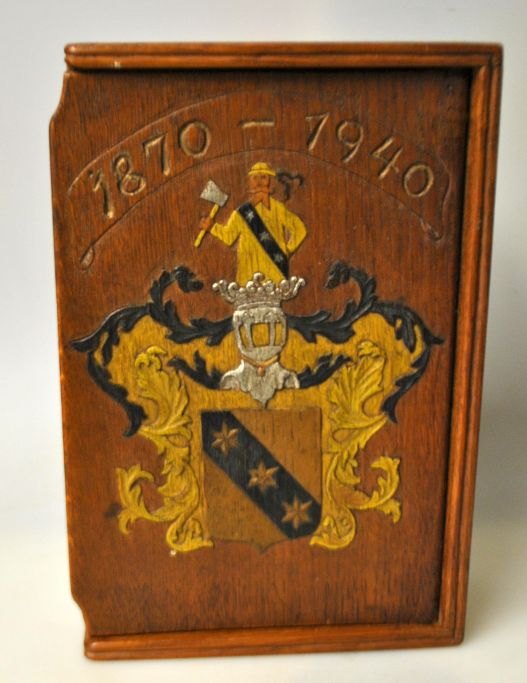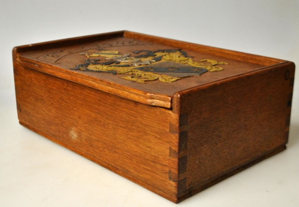Dänische Eichenschatulle mit einer Schnitzerei in Form eines Adelsabzeichens auf dem Deckel, 1940. Die Schatulle wurde im Zusammenhang mit einem Jubiläum oder Geburtstag entworfen. Aufgemaltes Wappen. H.: 10 cm. B.: 16,5 cm. L.: 25,5 cm.