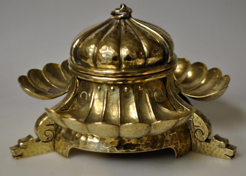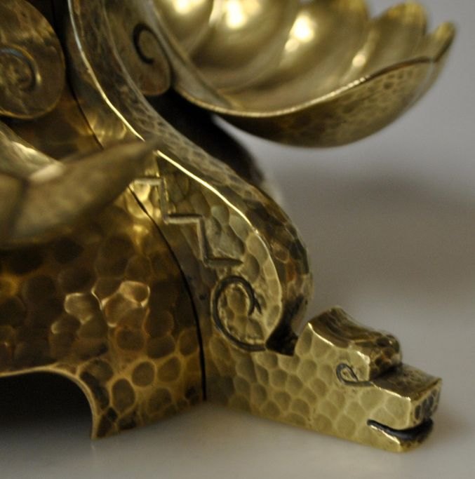Großes Tintenfass aus Messing, Art déco, um 1920, Dänemark. Mit Drachenfüßen. Gehämmert. Innen: Tintenfass aus Glas. Höhe: 14 cm. Durchmesser: 22 cm.