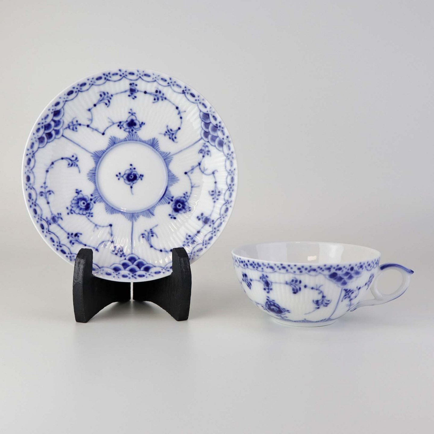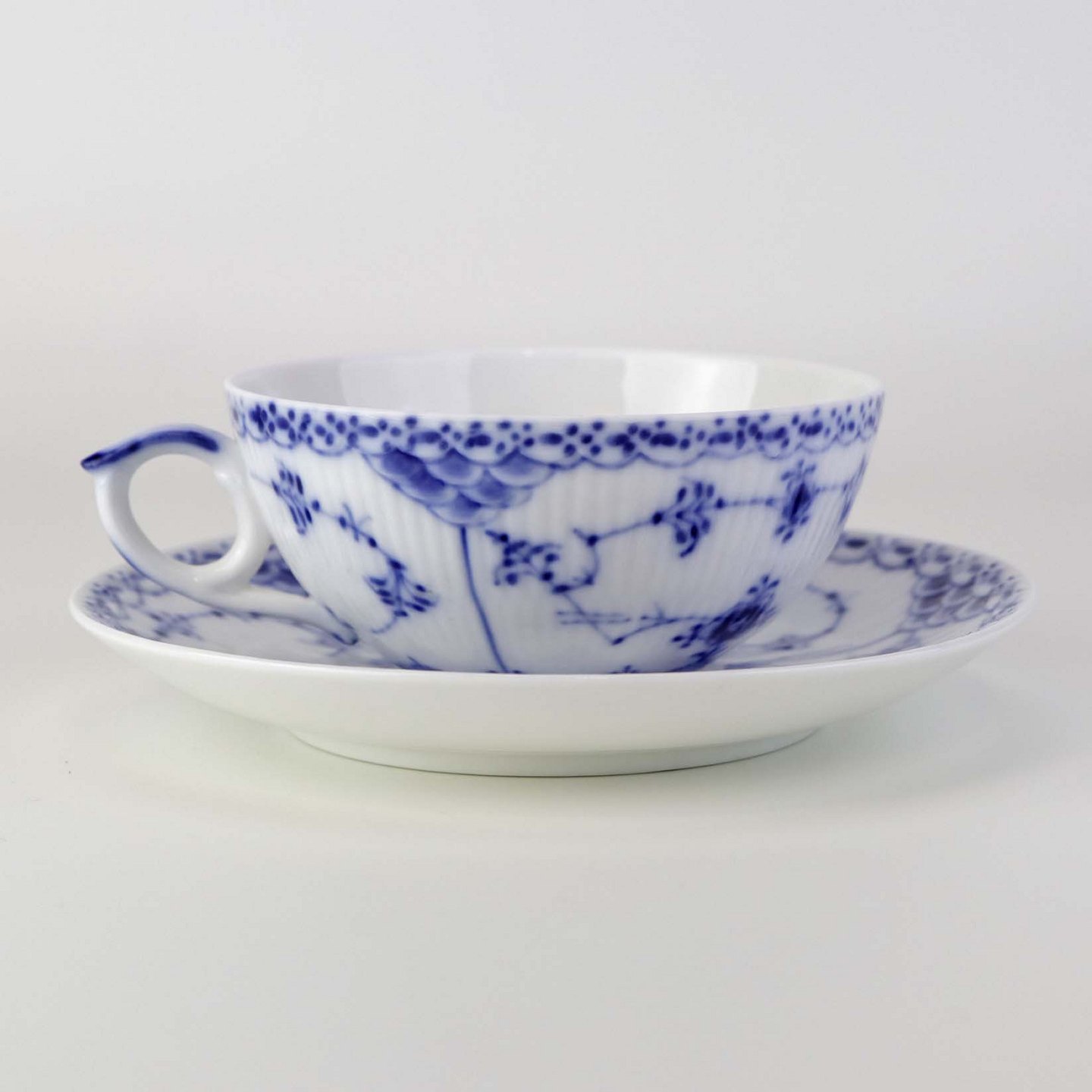 Mellemstørrelsse tekop med underkop i kongeligt porcelæn fra stellet Musselmalet Halvblonde. Nr. 1/525 og 1/525-626-656