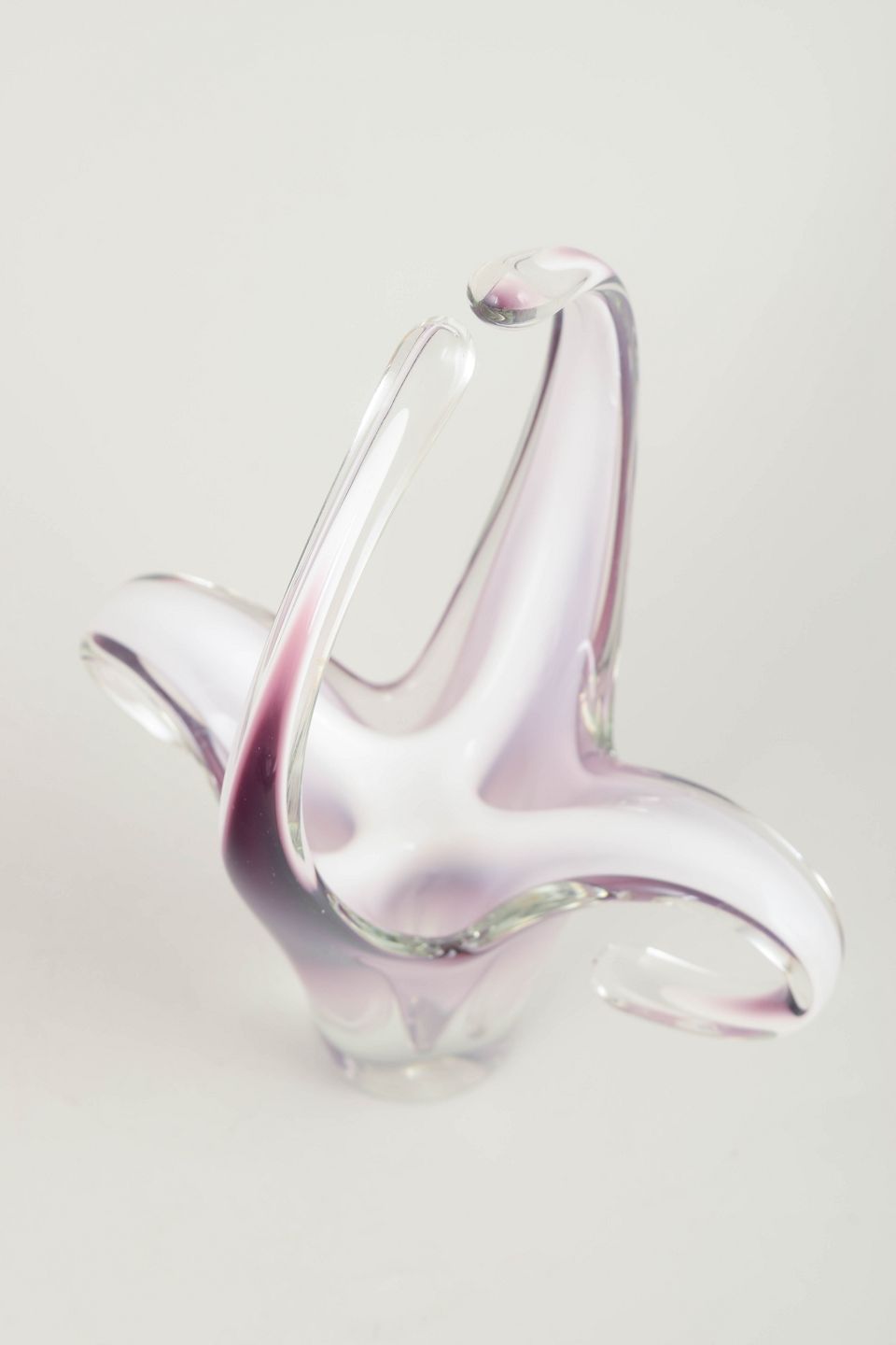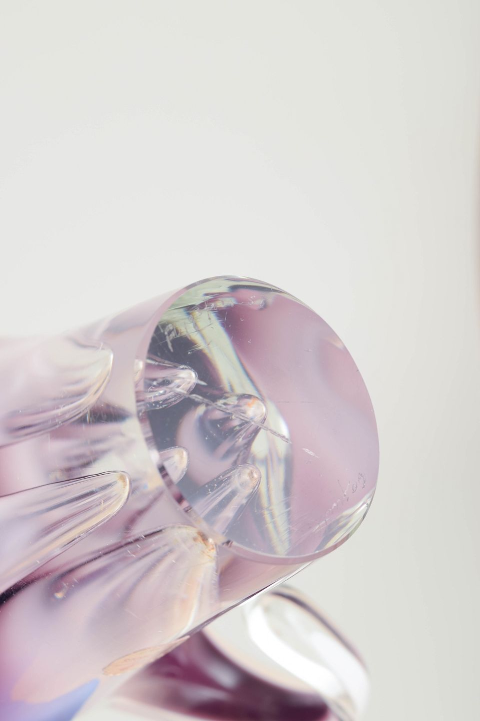Stor og dramatisk “Coquille”-form i flerlaget kunstglas med lys rosa til violet farvegraduering, hvidt mellemlag og klart yderglas. De opadstræbende, bølgende arme giver et elegant, blomsteragtigt og skulpturelt udtryk – et af Kedelvs mest karakteristiske formsprog.