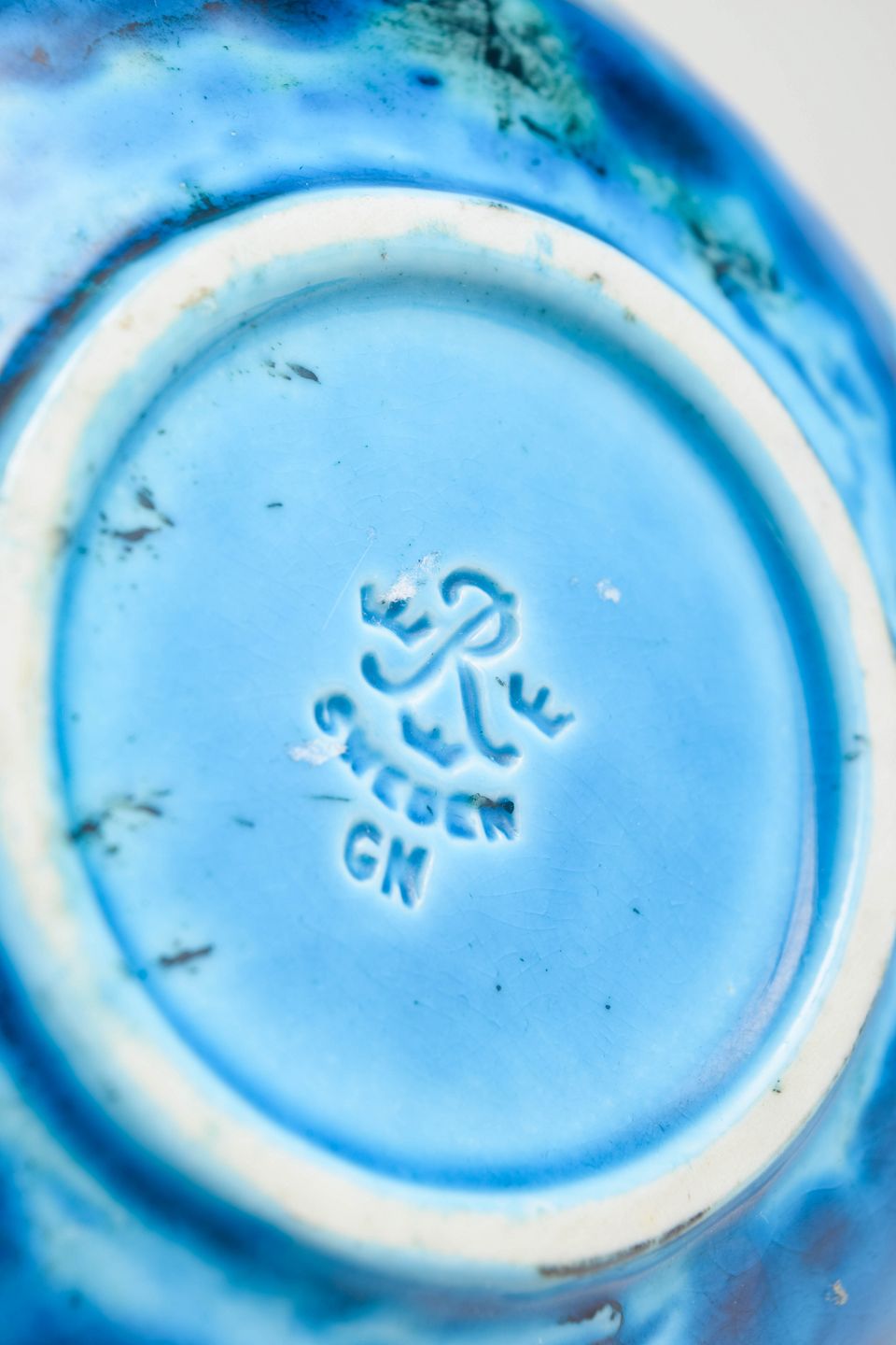 Håndformet skål i keramik med levende turkisblå glasur og indridset dekor i form af stiliseret blomstermotiv. Et karakteristisk eksempel på Nylunds organiske formsprog og farverige udtryk fra perioden.