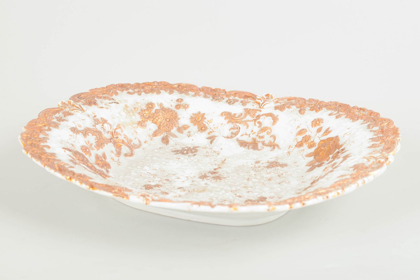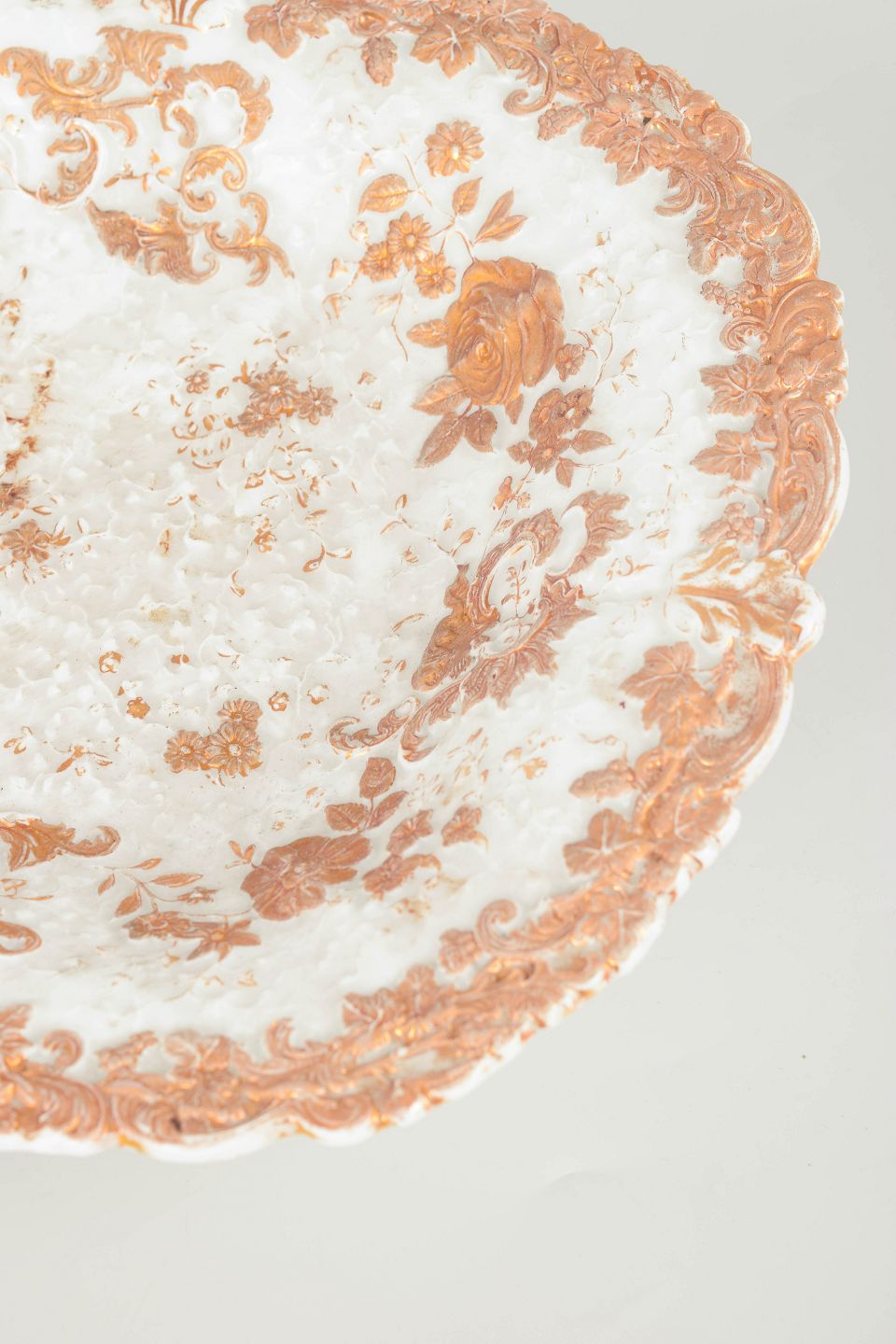 Rektangulært porcelænsfad fra Meissen med rigt dekoreret rokokoinspireret relieframme og omfattende håndmalet kobber-guldbemaling. De florale motiver og de svungne ornamenter giver fadet et karakteristisk og overdådigt udtryk fra slutningen af 1800-tallet.