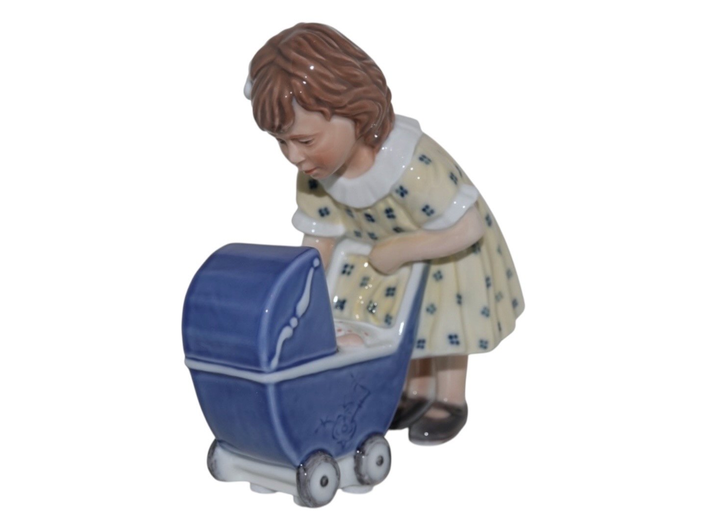 Større Royal Copenhagen figur, pige med blå barnevogn.