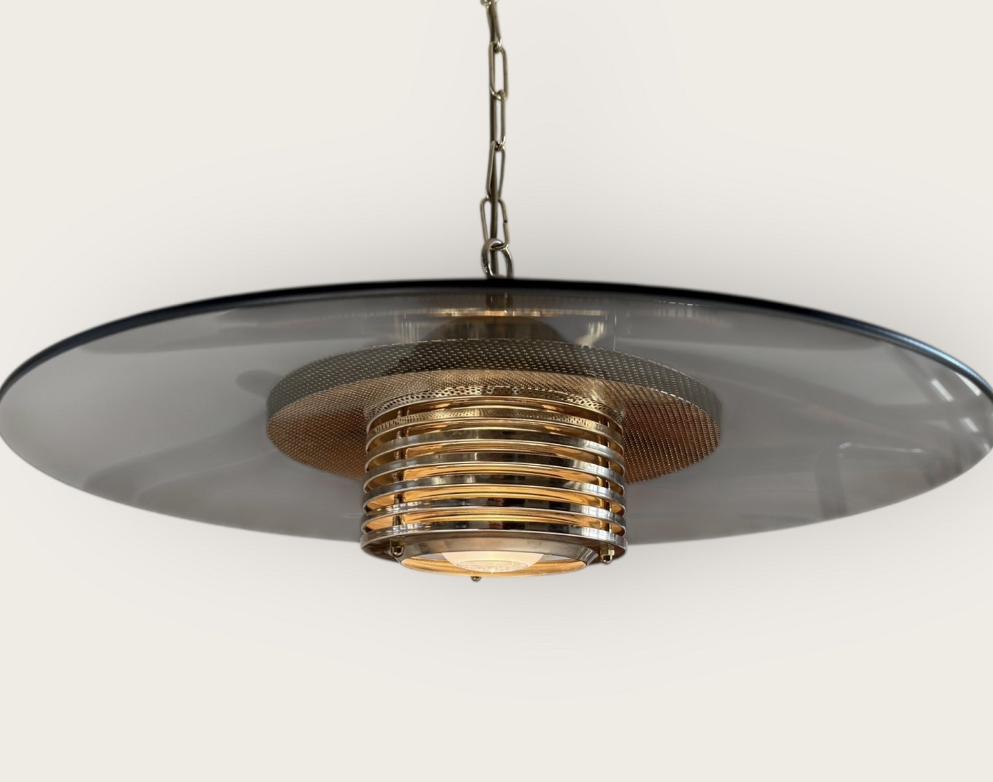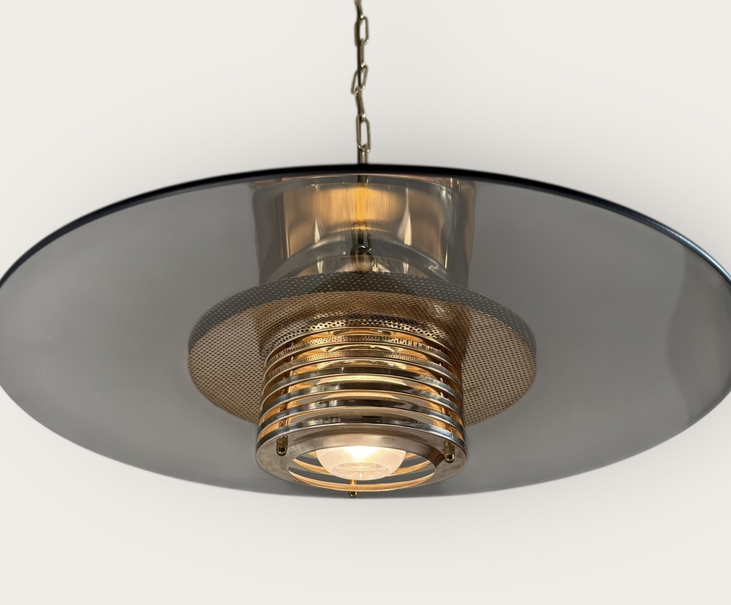 Jan-Eskild Eskildsson, Belid, Schweden, Reflektor-Deckenleuchte aus Rauchglas und Messing, Durchmesser 49 cm *guter Zustand*