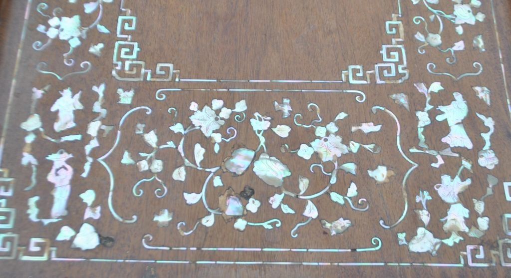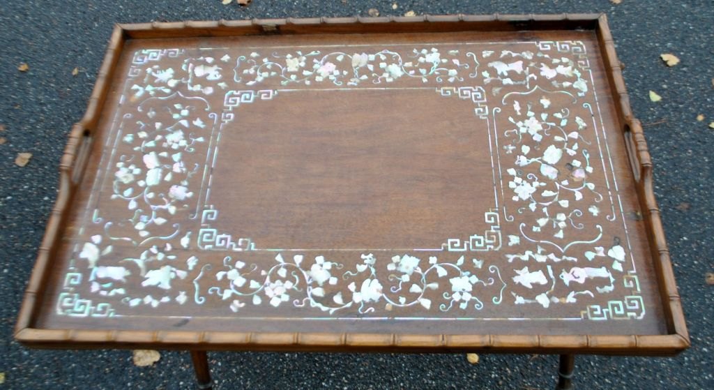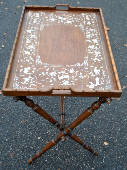 Chinesischer Tabletttisch, 19. Jahrhundert. Tablett aus edlem Holz mit Perlmuttintarsien. Mit zwei Griffen. 48 x 71 cm. Klappbarer Sockel, Höhe: 65 cm.