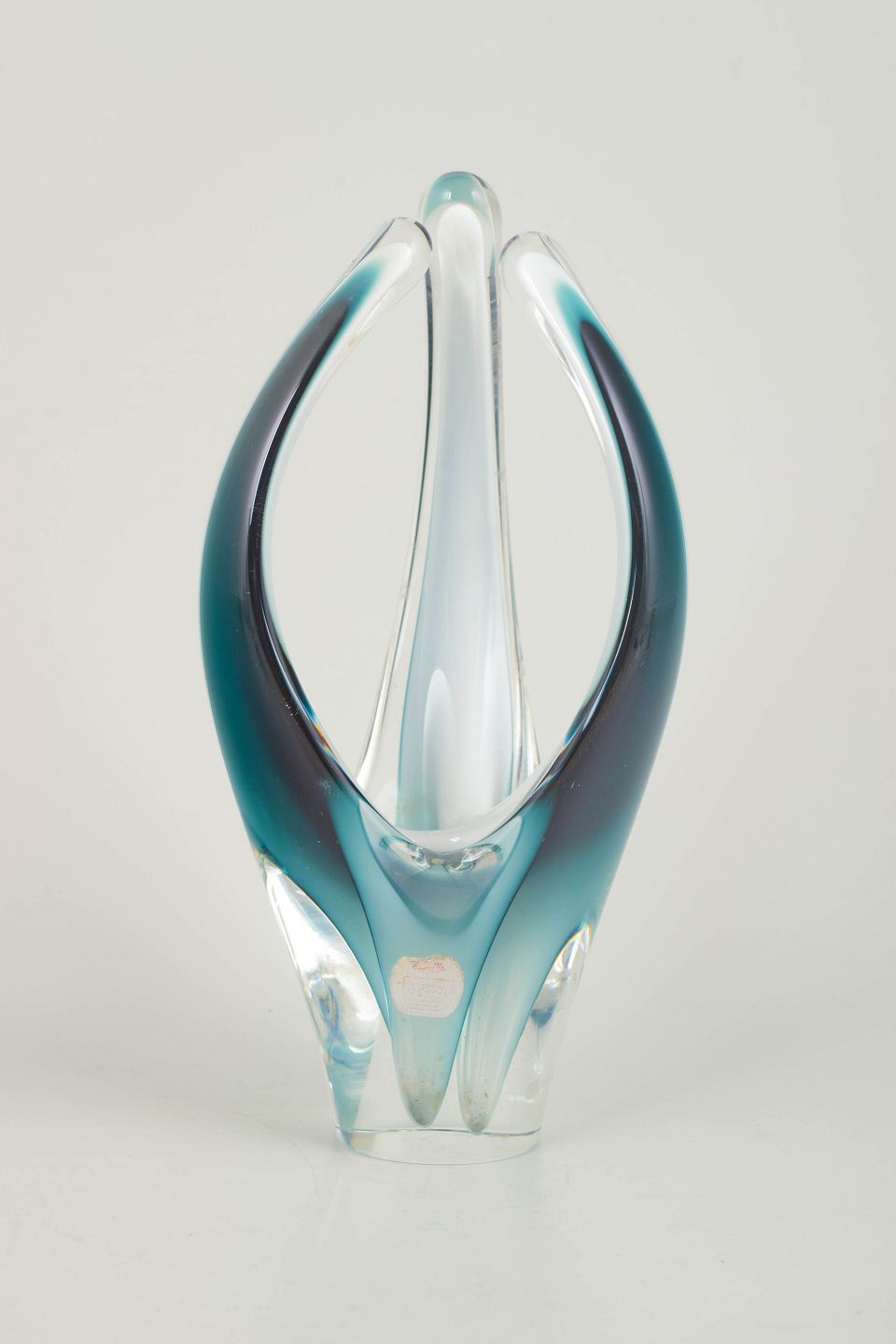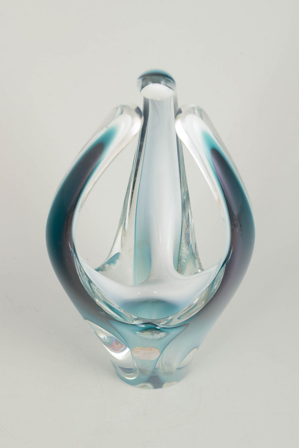 Organisk, skulpturel kunstglas vase/skulptur i klart glas med lag i turkis og dyb blå-violette toner. Mundblæst med de karakteristiske opadstræbende, svungne "flammer" fra Coquille-serien. Originalt Flygfors mærke. Signeret.