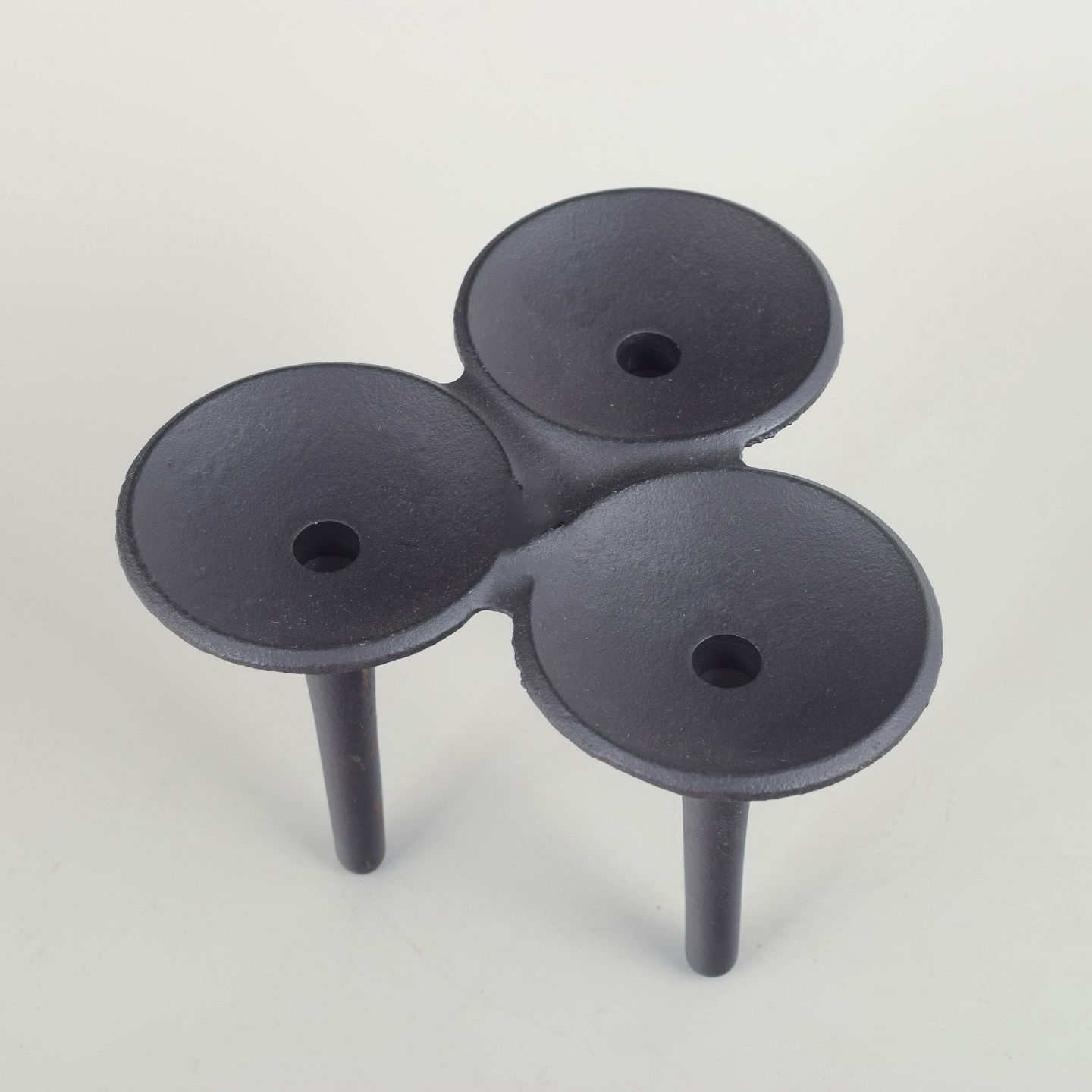 Skulpturel, organisk formet lysestage i sortlakeret støbejern, udført i Quistgaards karakteristiske modernistiske formsprog. De tre koniske ben mødes i en samlet top med tre skåleformede holdere.