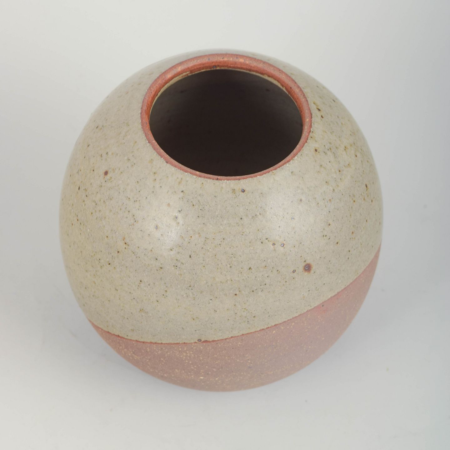 Hånddrejet stentøjsvase i afrundet, organisk form. Udført i Palms karakteristiske rå, taktile udtryk med en todelt, mat glasur: øverste del i lys, kalket tone og nederste del i støvet rosa. Et elegant og harmonisk eksempel på Palms mere minimalistiske arbejder fra perioden.