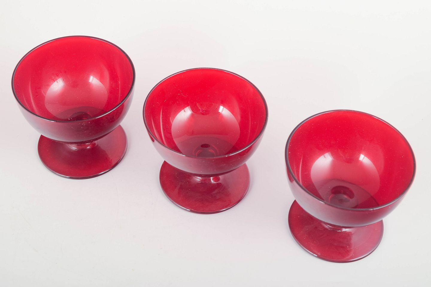 Sæt af tre rubinrøde dessertglas i klassisk, let udadsvungen form på lav fod. Smukt farvet glas i den ikoniske Reijmyre-røde tone.