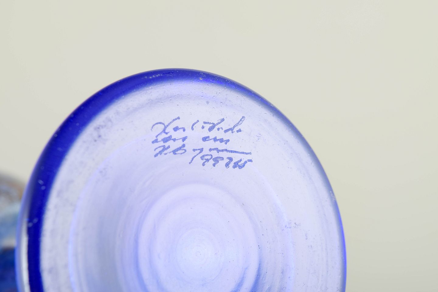 Signeret kunstglasbæger i intens koboltblå med dekoreret bælte af multikolorerede indsmeltede partikler. Skulpturelt formet fod og klassisk bægerform, typisk for Engmanns farvestærke og fortællende udtryk.