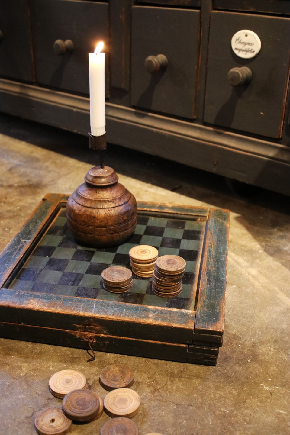 Charmerende antik 1800 tals spilleæske / brætspil i bemalet træ med 3 forskellige spil. Har en super fin patina.