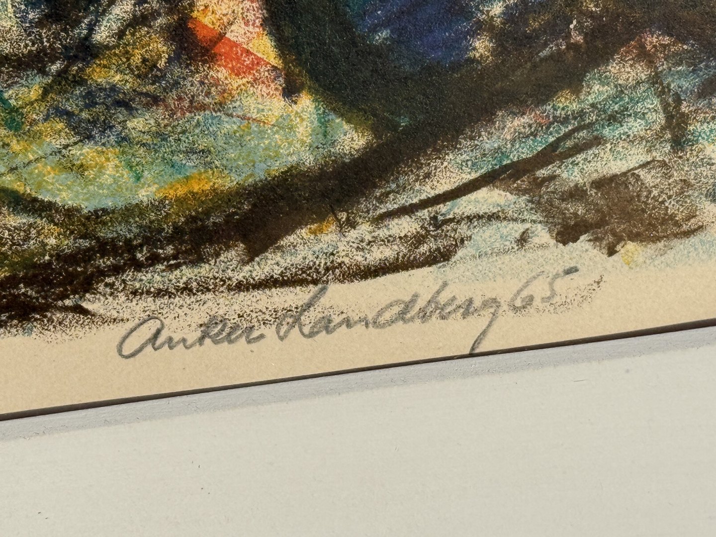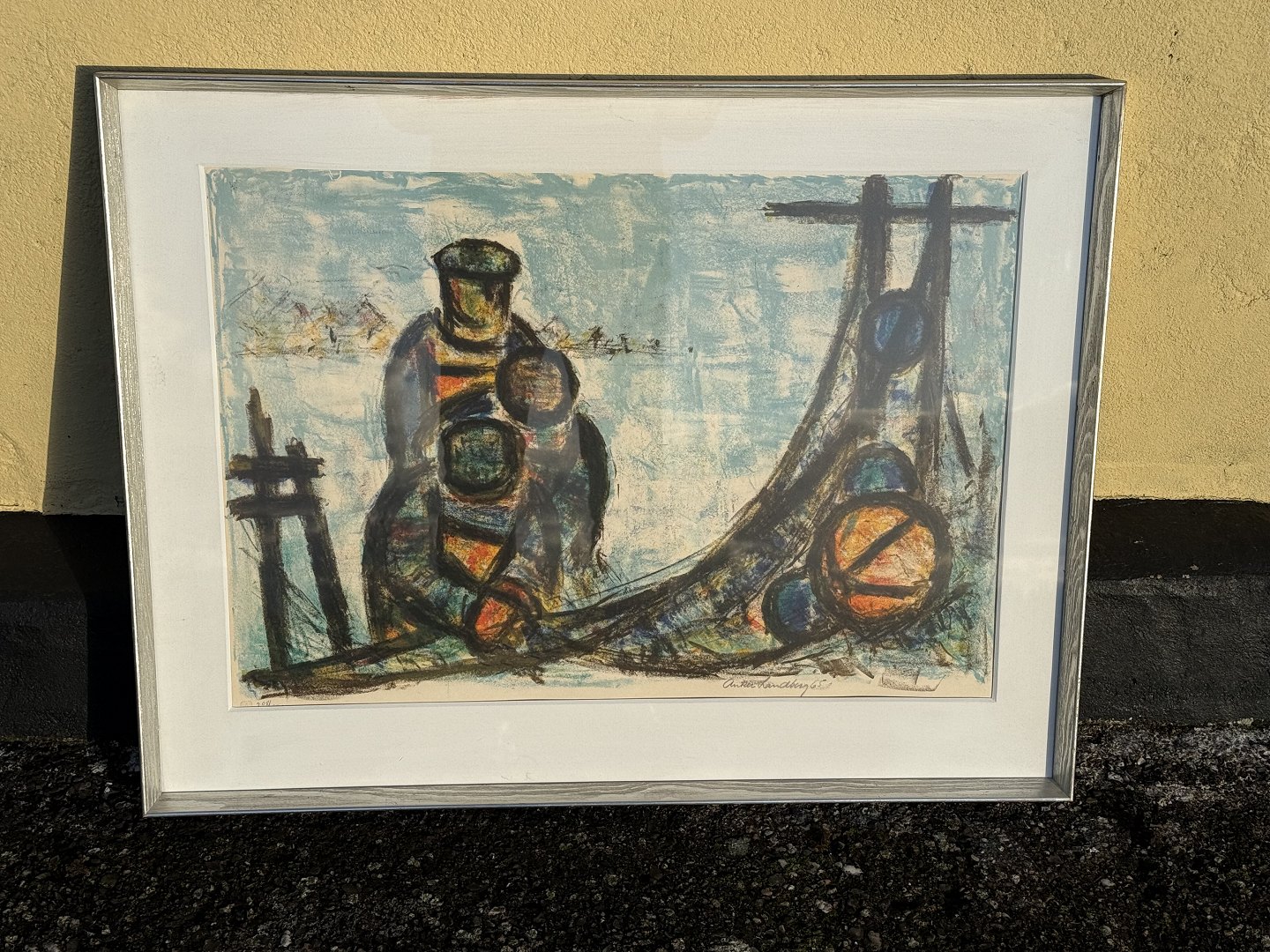 Anker Landberg, Lithografie im Rahmen, Fischer reparieren Netze, signiert Anker Landberg 65, Maße: 67 x 46 cm, Maße mit Rahmen: 82 x 63 cm *sehr guter Zustand*