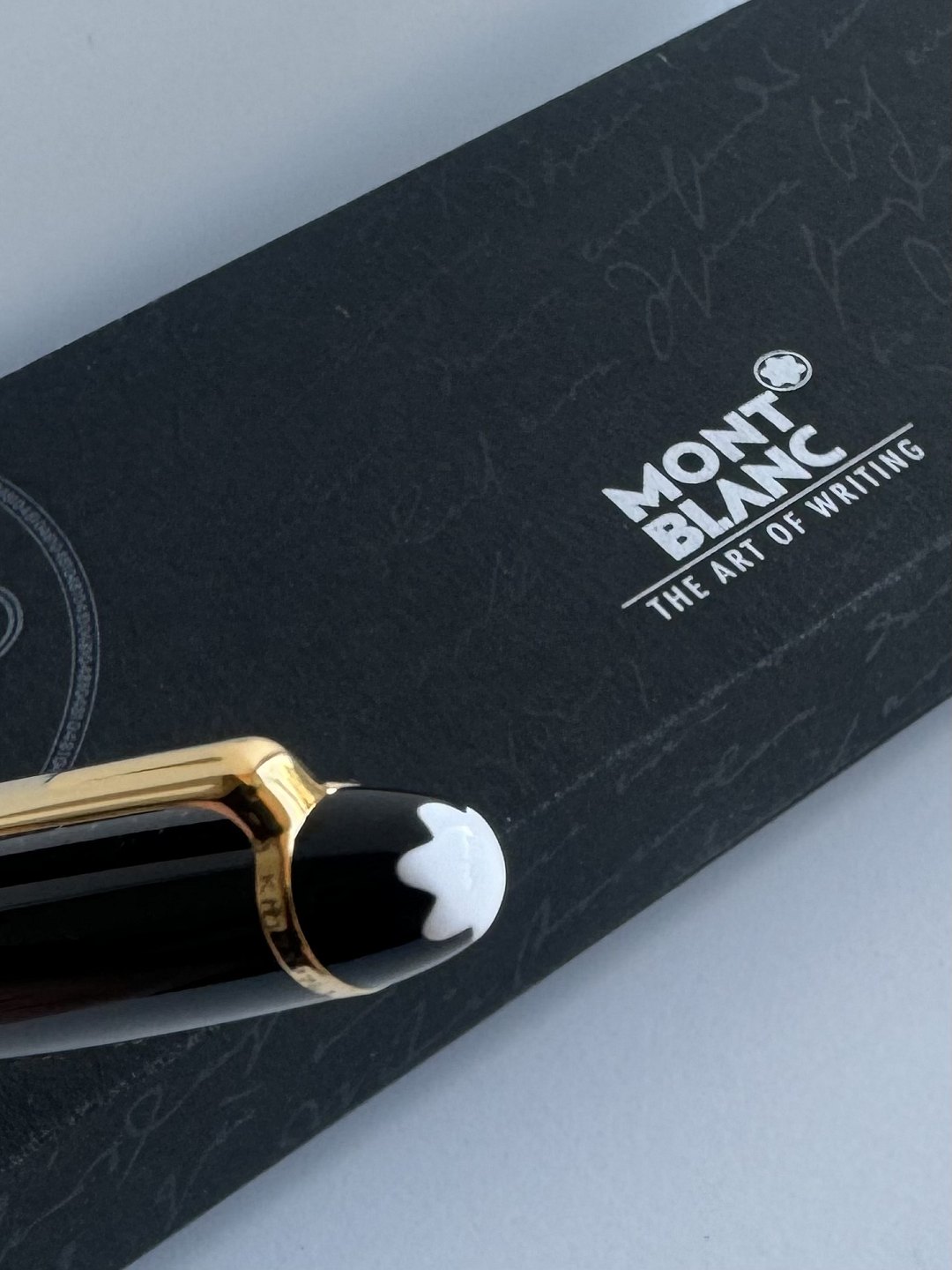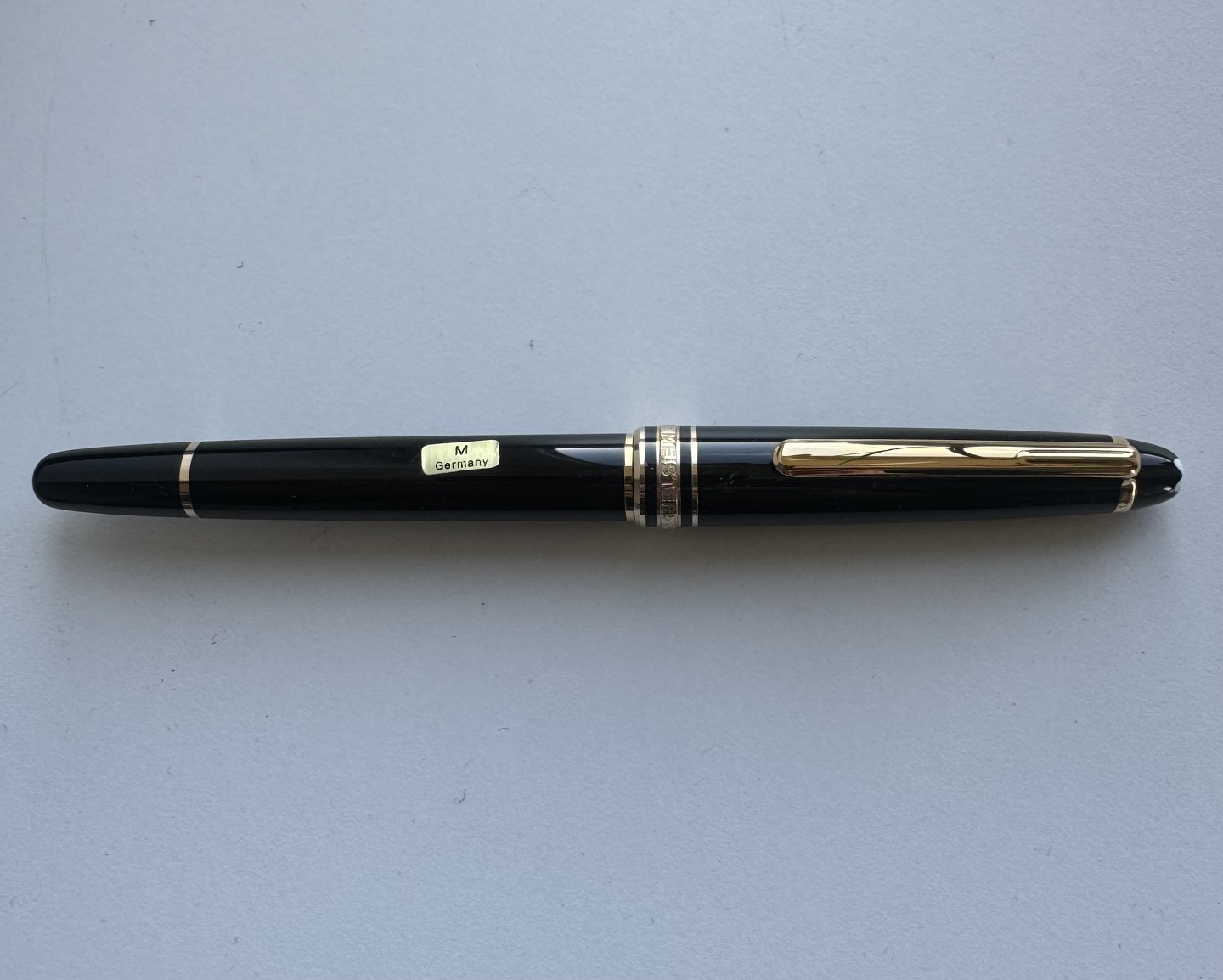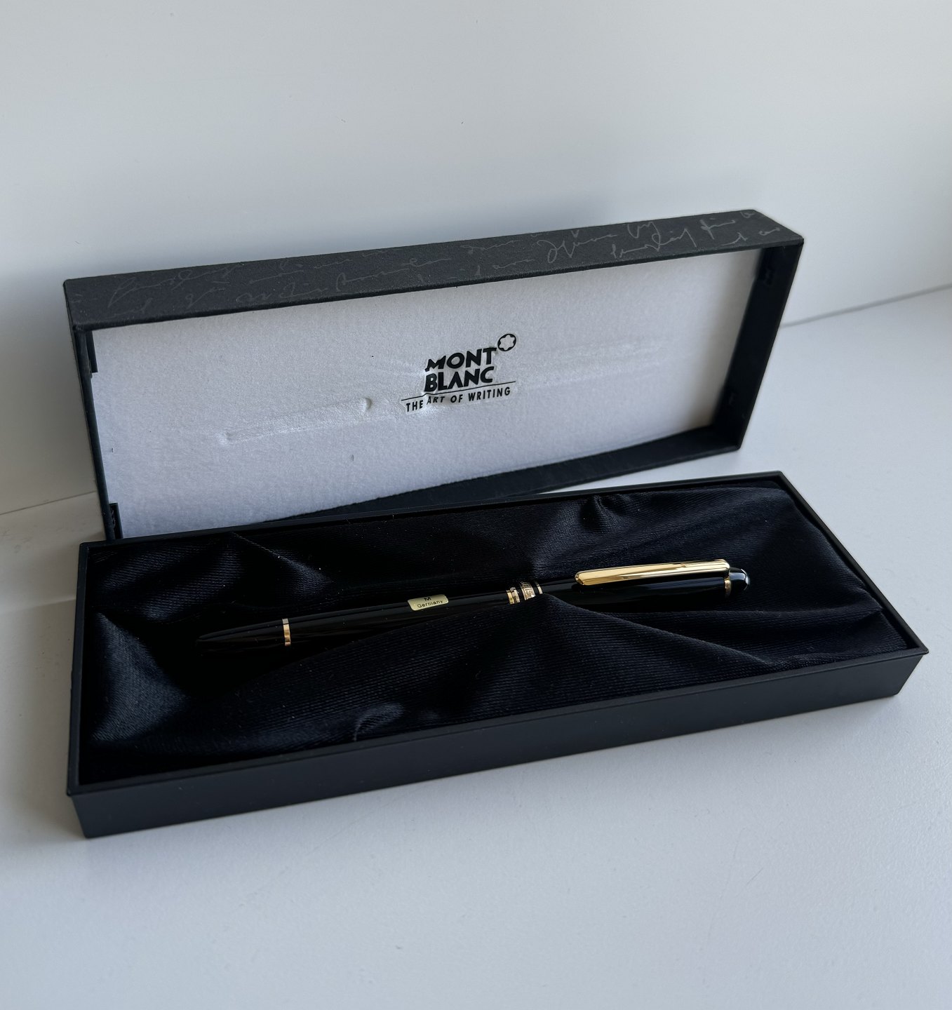 Nyere ubrugt sort Montblanc Classique Meisterstück fyldepen. Fremstår i perfekt stand. Alle dele originale til denne model inklusiv den elegante 18 karat’s to-farvede Montblanc guldspids i Medium størrelse (se label på fyldepennen). Original æske samt instruktionsbog medfølger.