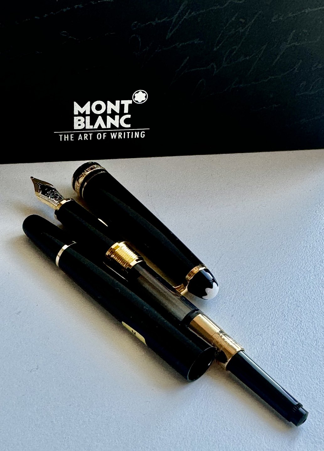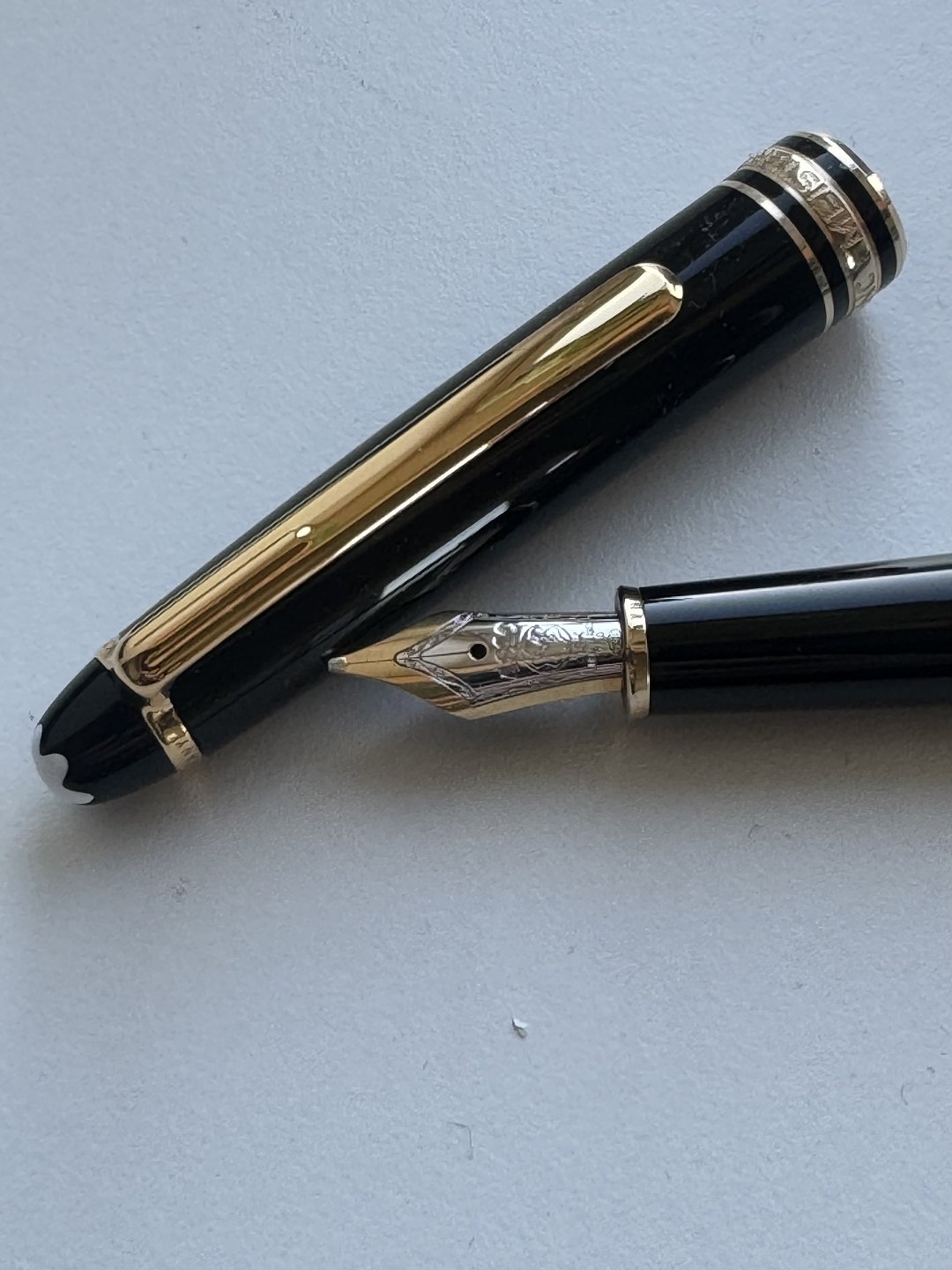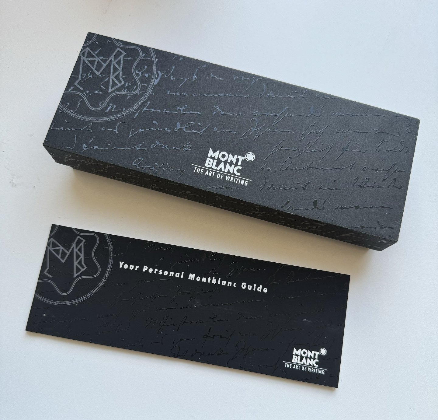 Nyere ubrugt sort Montblanc Classique Meisterstück fyldepen. Fremstår i perfekt stand. Alle dele originale til denne model inklusiv den elegante 18 karat’s to-farvede Montblanc guldspids i Medium størrelse (se label på fyldepennen). Original æske samt instruktionsbog medfølger.