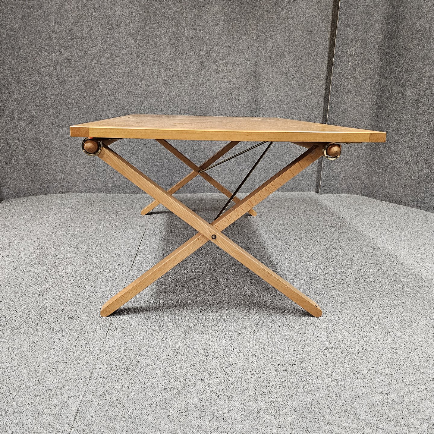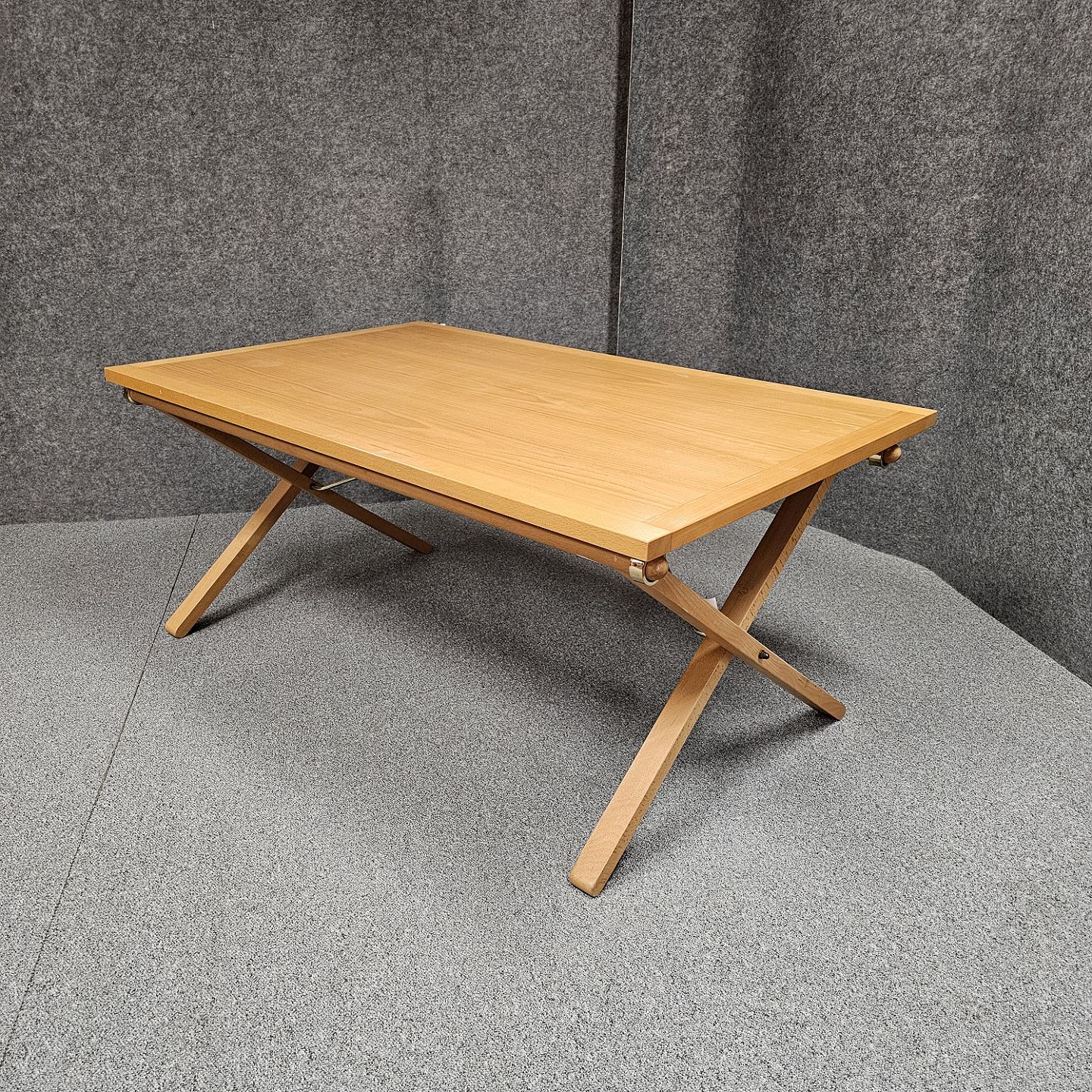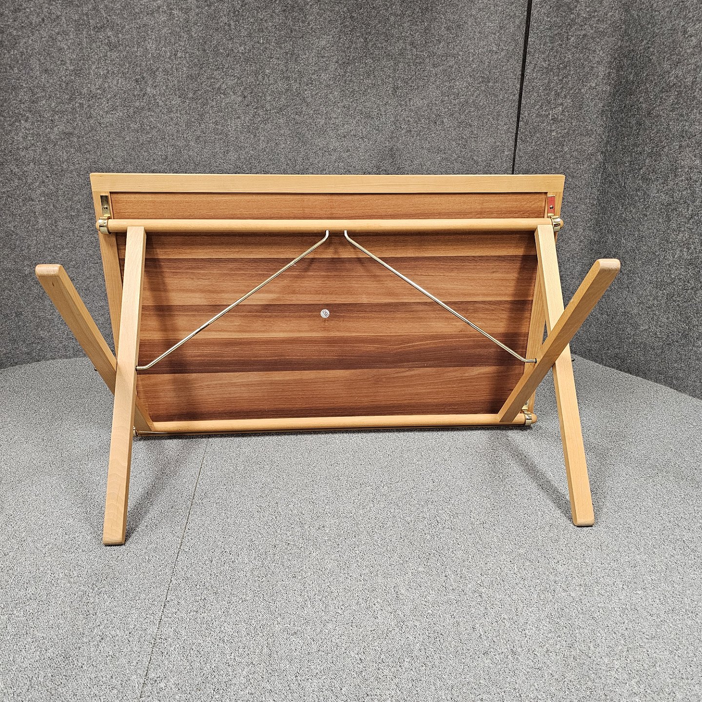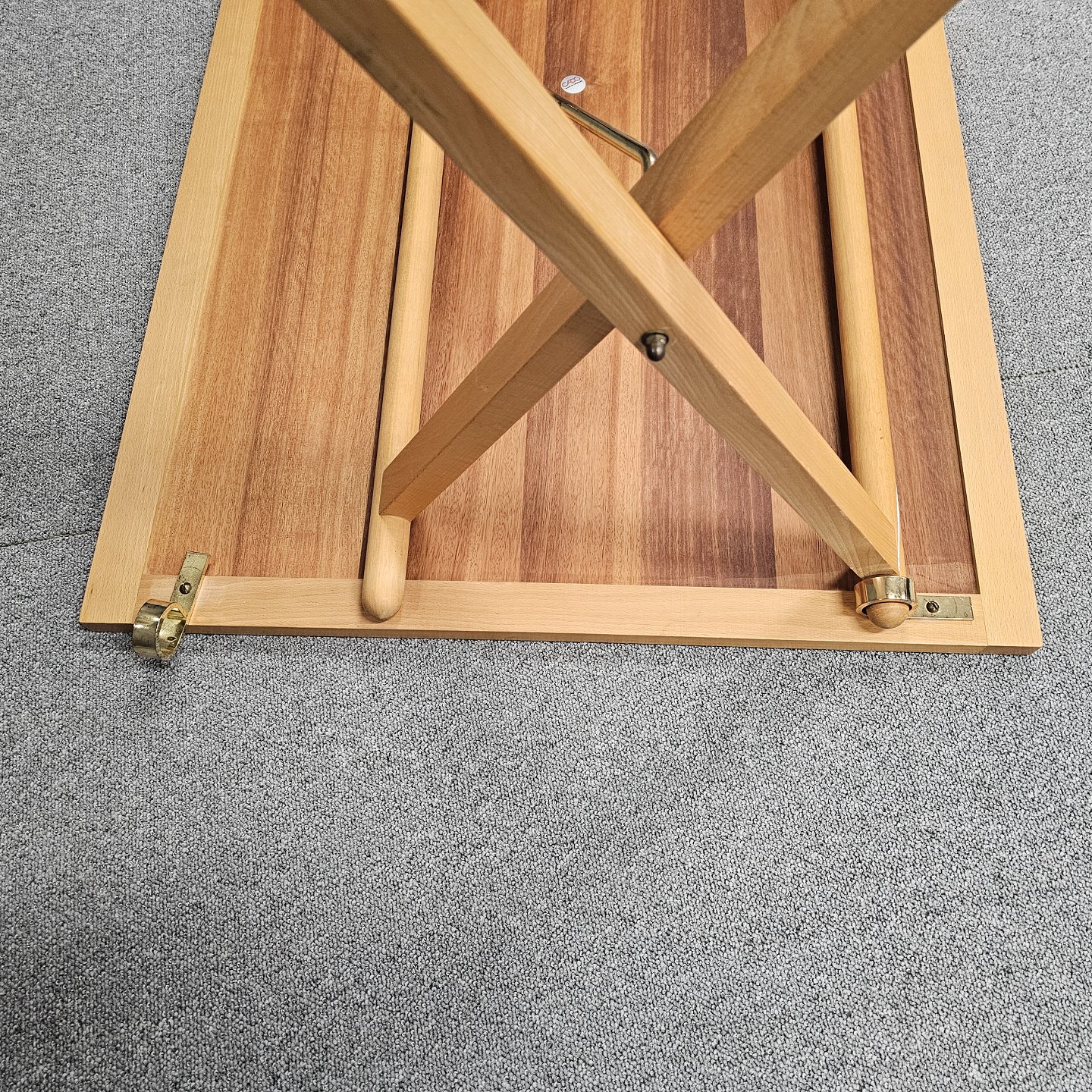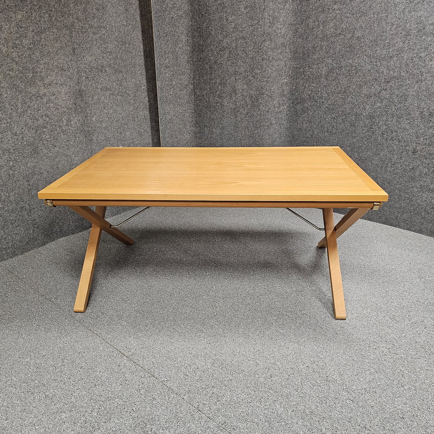 Text zugänglich auf Dänische: Bord i lyst træ med justerbar højde så det kan fungere som både spisebord og sofabord. Der er 4 mulige højder
