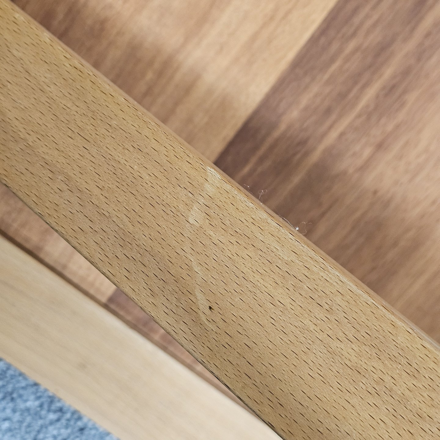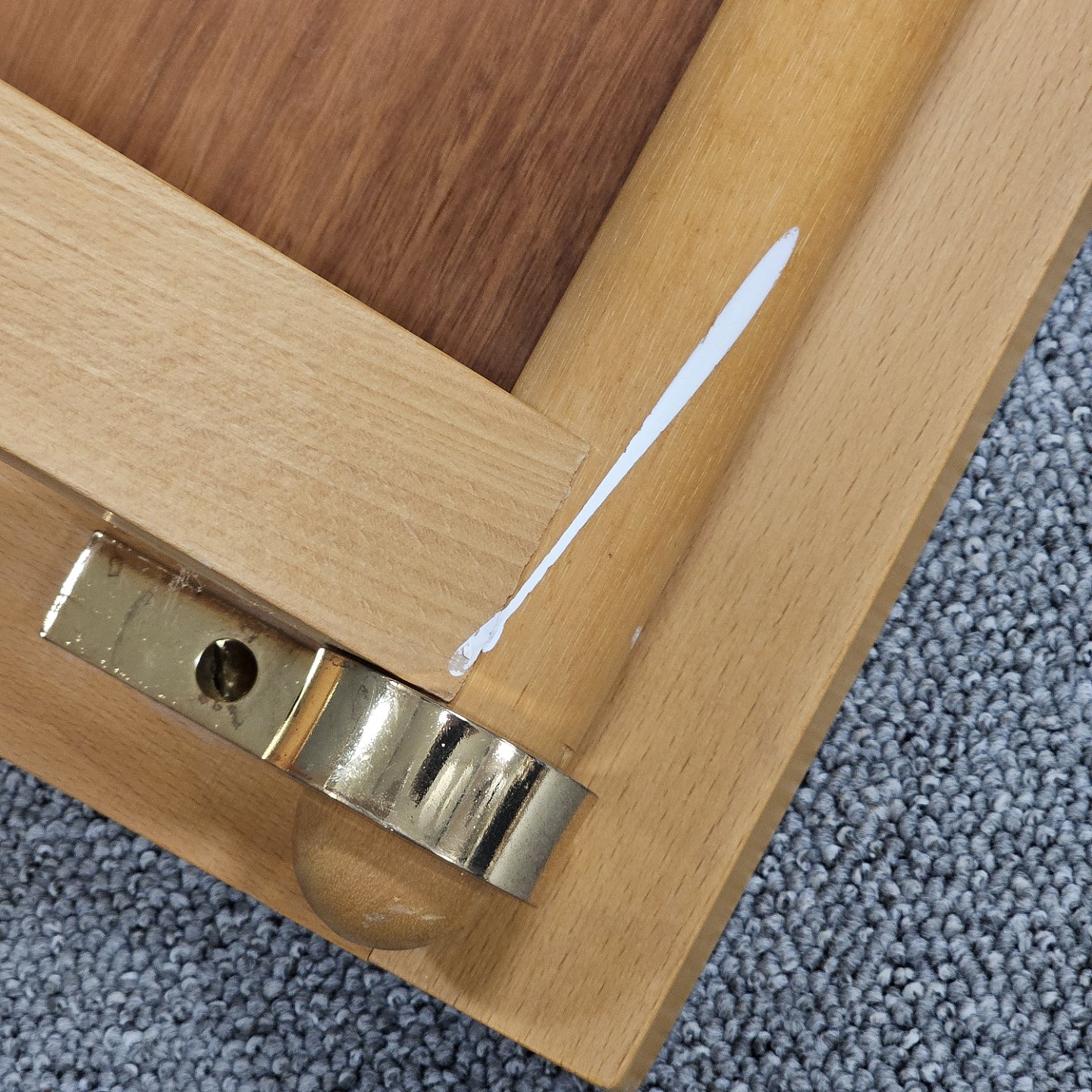 Brugsspor i form af små mærker og misfarvninger på træet, samt en streg indtørret maling på undersiden