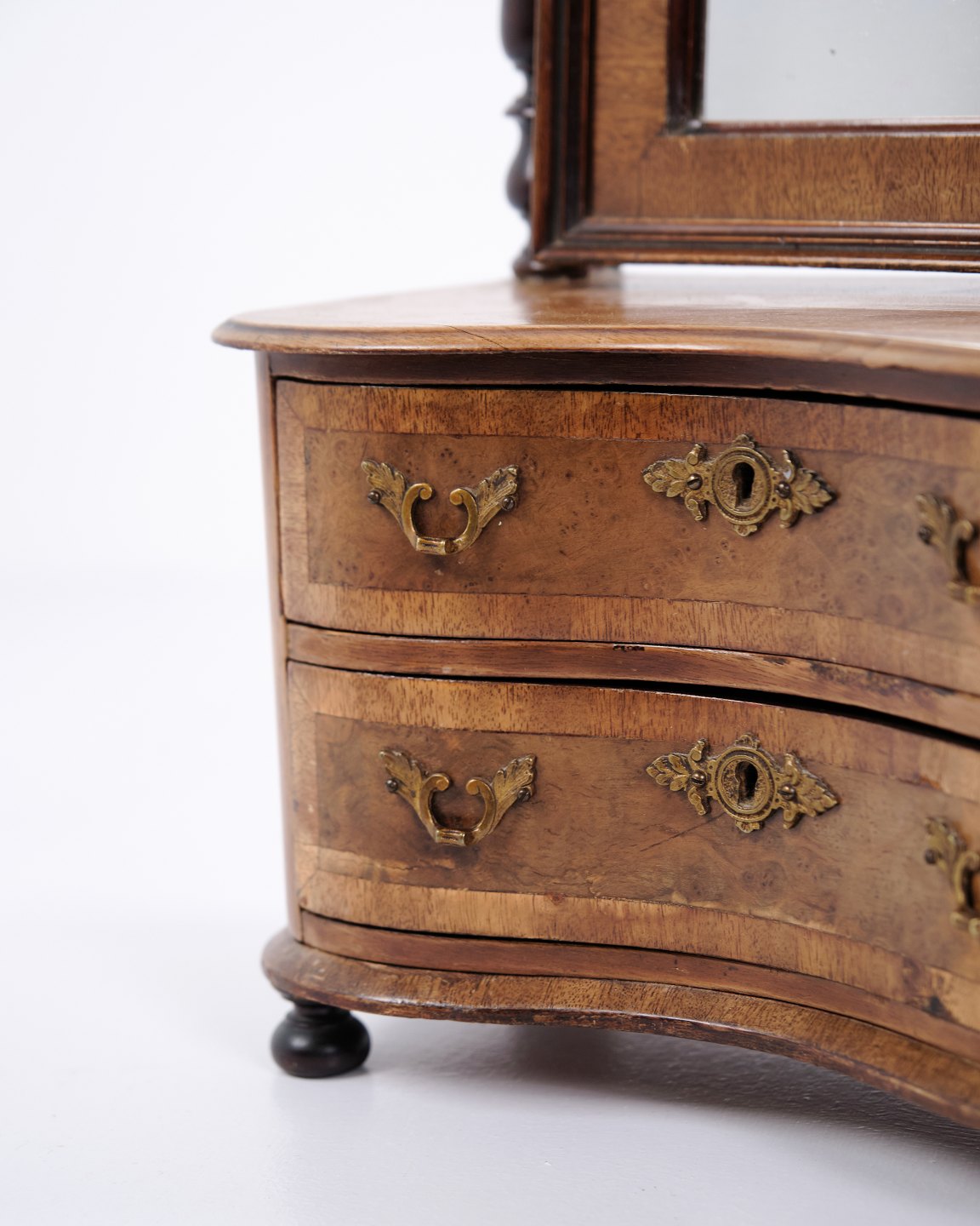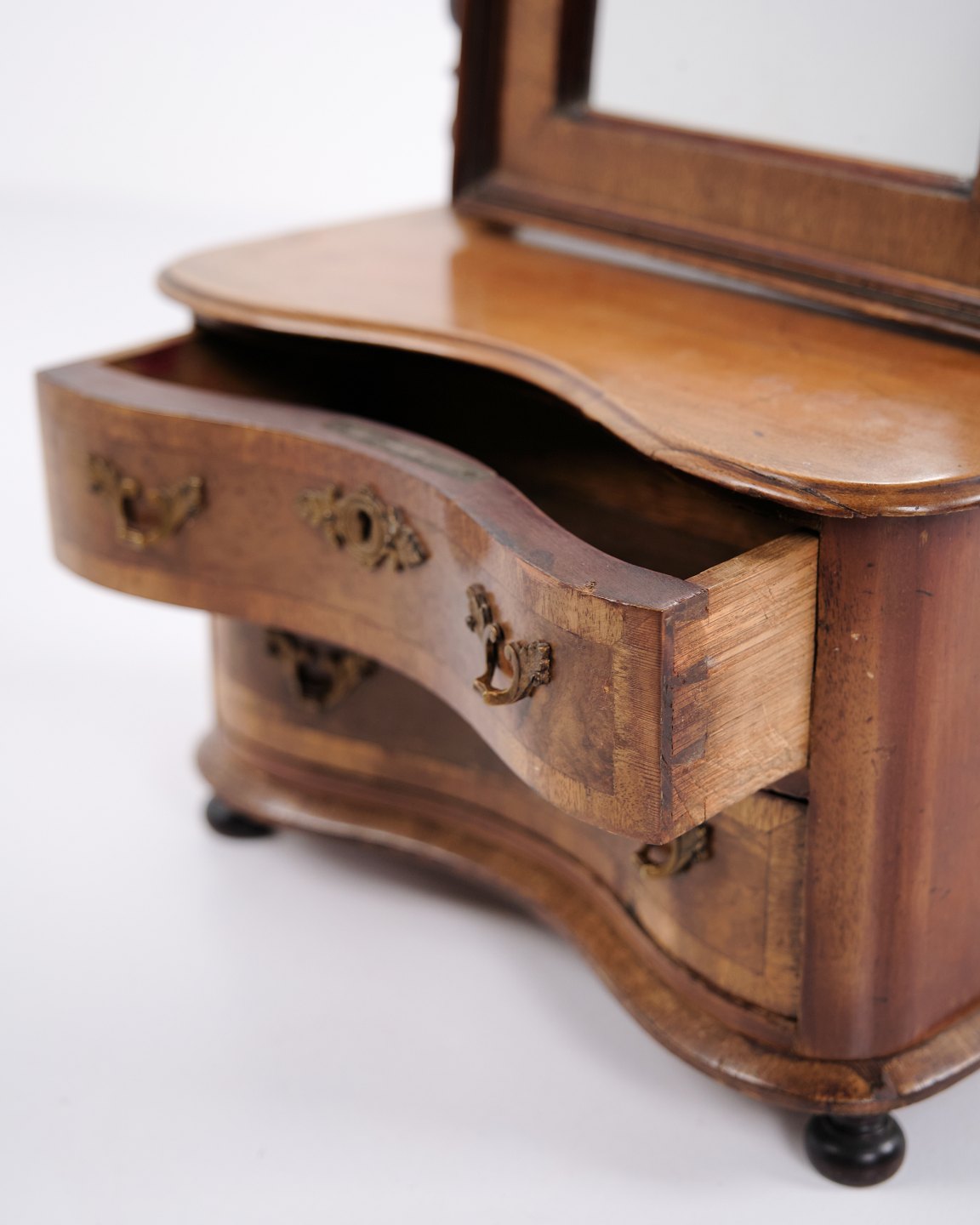 Lille barnemøbel fra ca. 1860, udført i mahogni med spejl og to skuffer. Et dekorativt og sjældent antikt møbel med fine detaljer, velegnet som samlerobjekt eller til klassisk indretning.