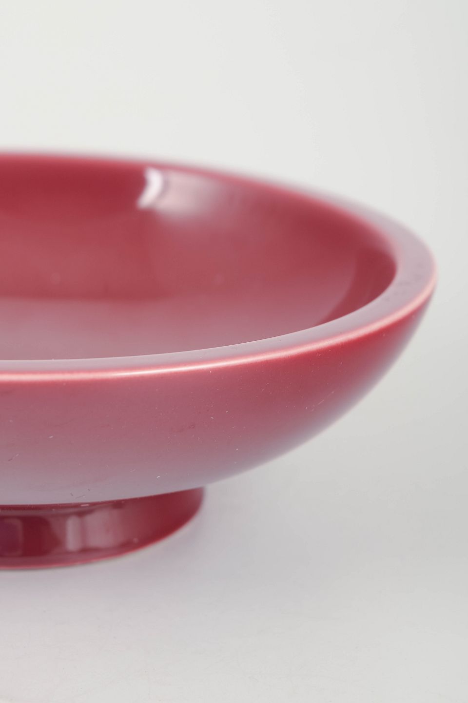 Sjælden skål i rødt glasur, med lav fod og elegant, enkel form.