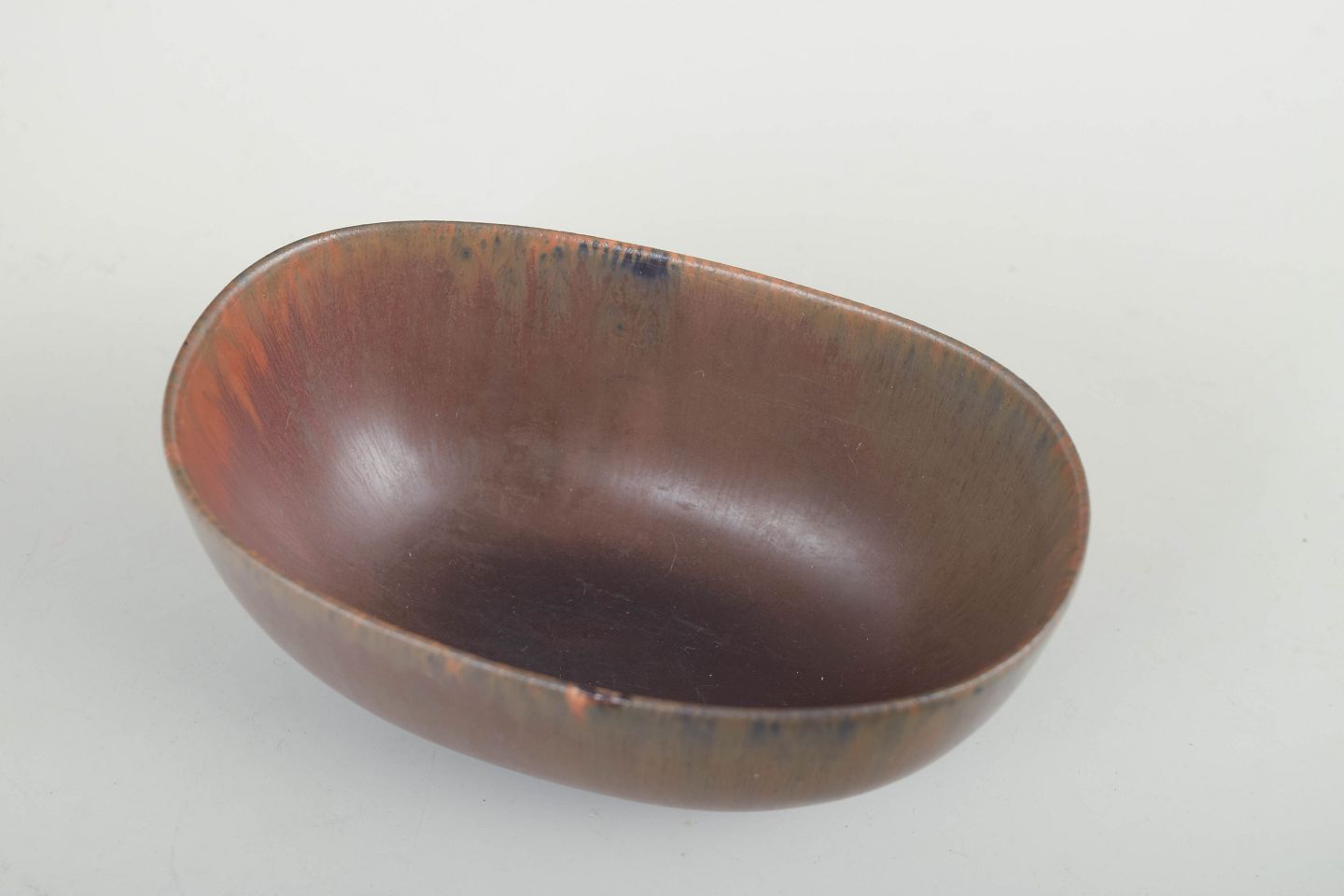 Ovalformet skål i stentøj med lav fod og rødbrun glasur med mørke løbende toner – et eksempel på Stålhanes elegante, reducerede formsprog og raffinerede glasurarbejde. Stemplet som 2. sortering.