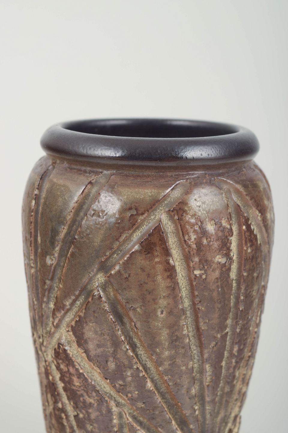 Reliefdekoreret vase i stentøj med markant indridset blad- og linjemønster samt mørk glasur langs kanten. Model 3063A.