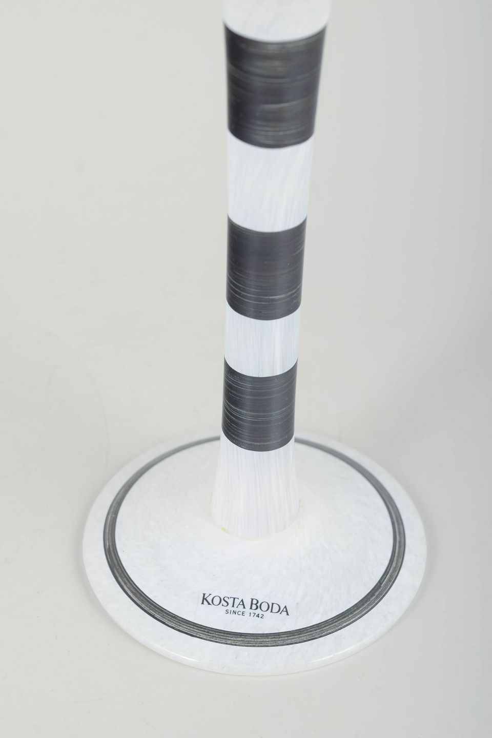Højt dekorativt kunstglas med håndmalet blomstermotiv i gule og grønne toner på mørk baggrund, samt karakteristisk stribet stilk i sort og hvid. Signeret.