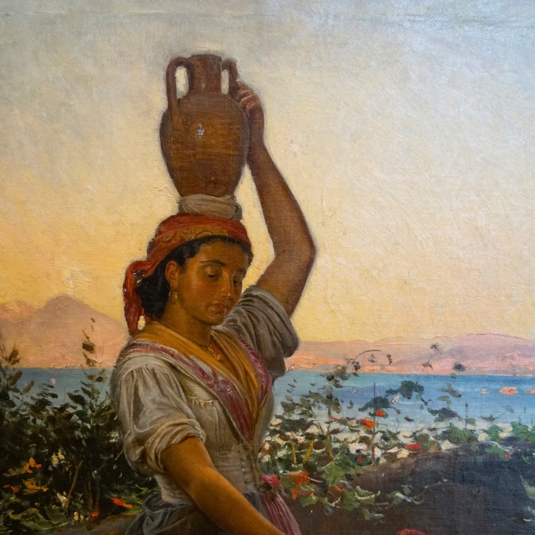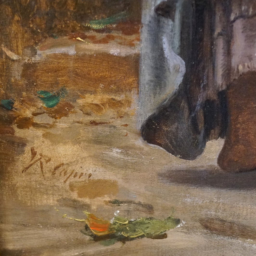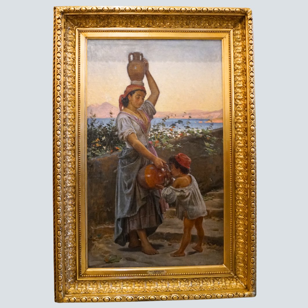 Text zugänglich auf Dänische: Vilhelm Rosenstand; Oliemaleri med kvinde og barn, motiv fra Italien. Olie på lærred. Signeret.