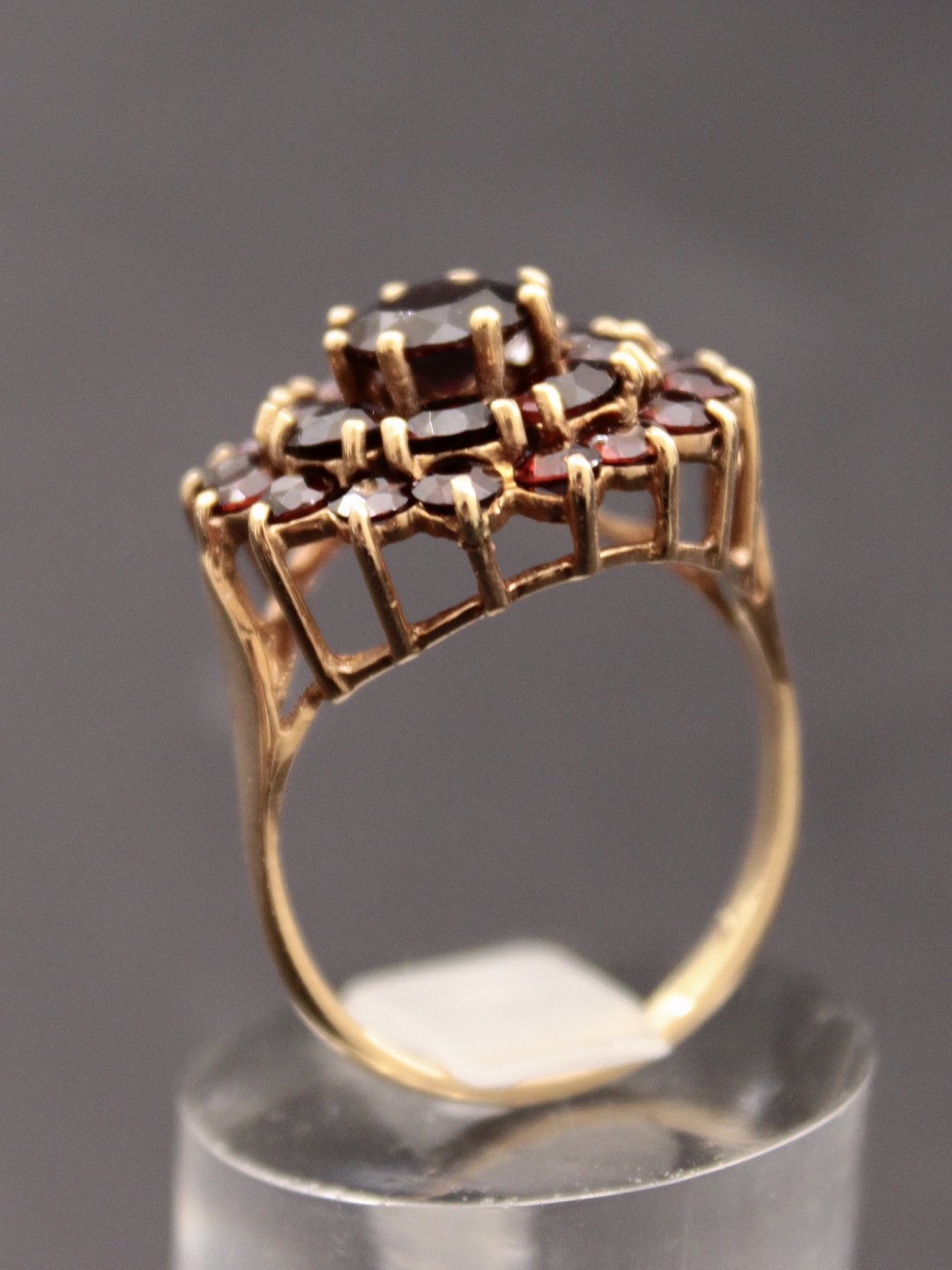 14 karat cocktail ring størrelse 59 med adskillige granater stemplet GIFA 585 emne nr. 626862