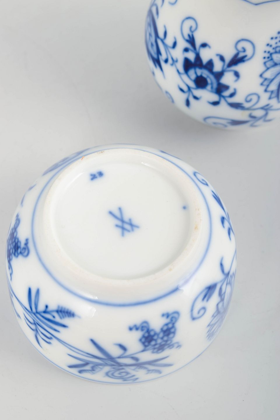 Meissen løgmønstret sukkerskål og flødekande, midt 1900-tal.