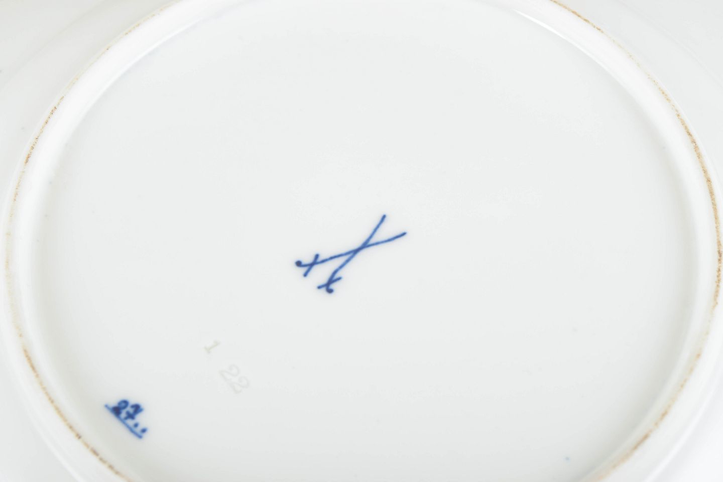 Fire klassiske Meissen tallerkener i det ikoniske løgmønstret med bølget kant og håndmalet blå underglasurdekoration. Et tidligt 20.-århundredes sæt i fin kvalitet.