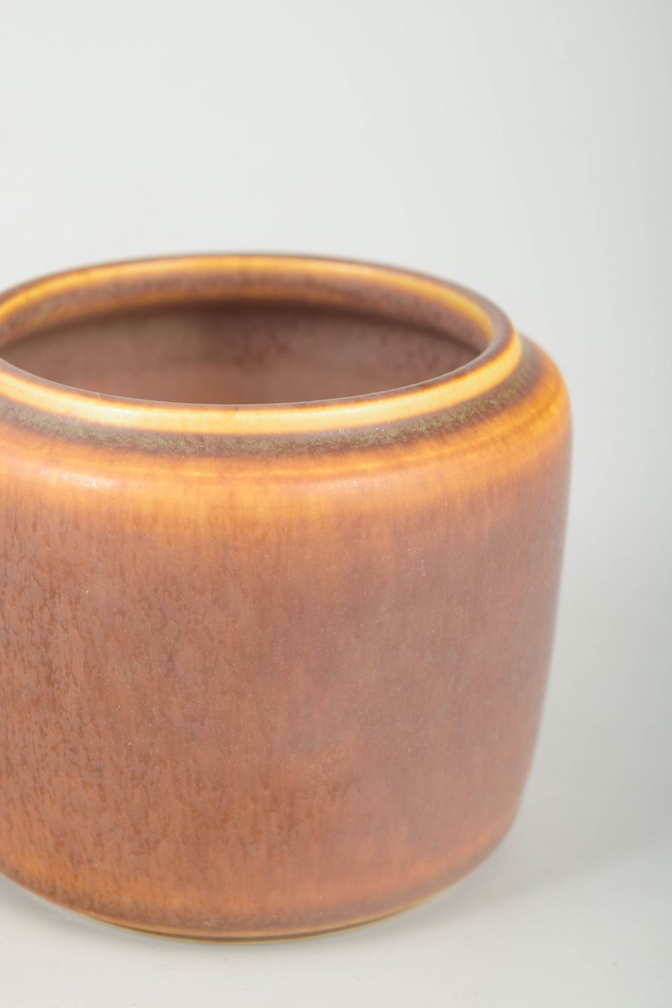 Smukt formgivet syltetøjskrukke i stentøj med karakteristisk harepelsglasur i varme brune toner.