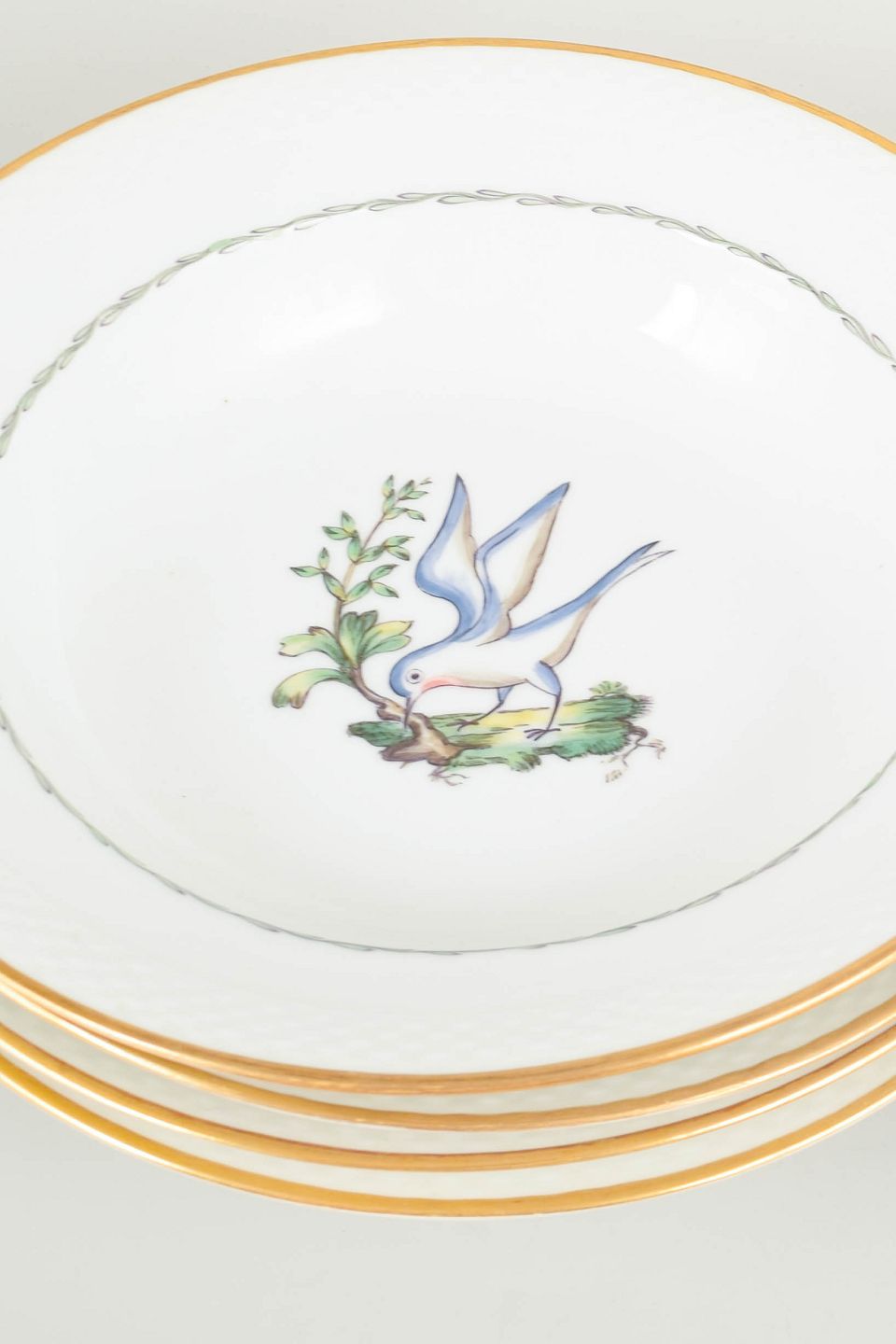 Sjældne dybe tallerkener i porcelæn fra Royal Copenhagen med motiv af fugle og botaniske elementer (model 550/8107). Hver tallerken er kantet med guldrand og har et elegant, let riflet fletrelief langs kanten.